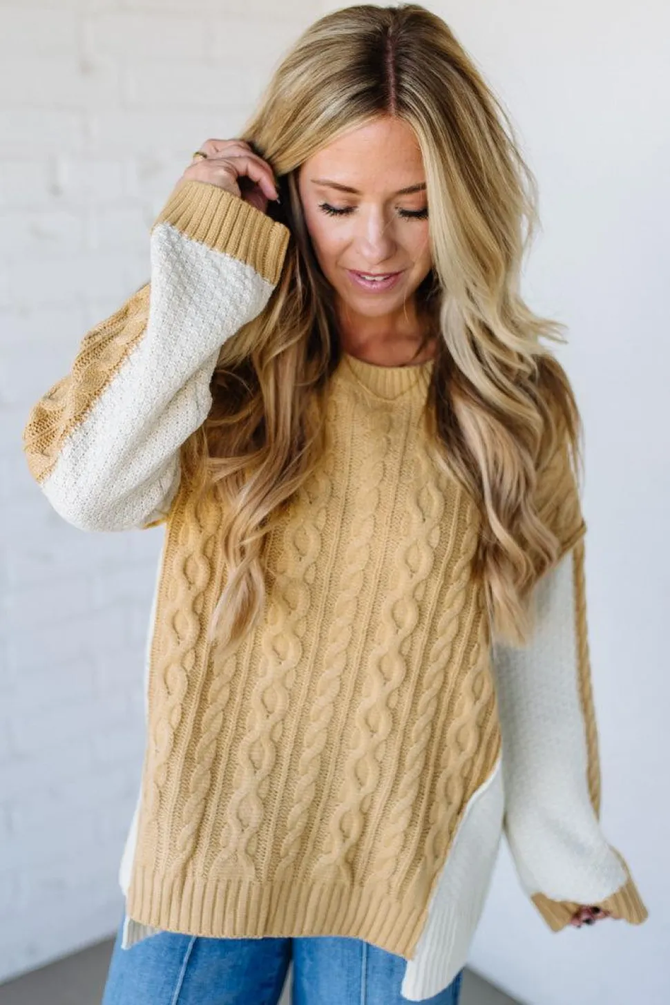 Perfect for busy women who want comfort and style without sacrificing warmth during unpredictable fall weather. The Cream Pie Cable Knit Sweater combines classic cable knit texture with a modern two-tone design, offering cozy coverage that feels intentional and polished, not frumpy.