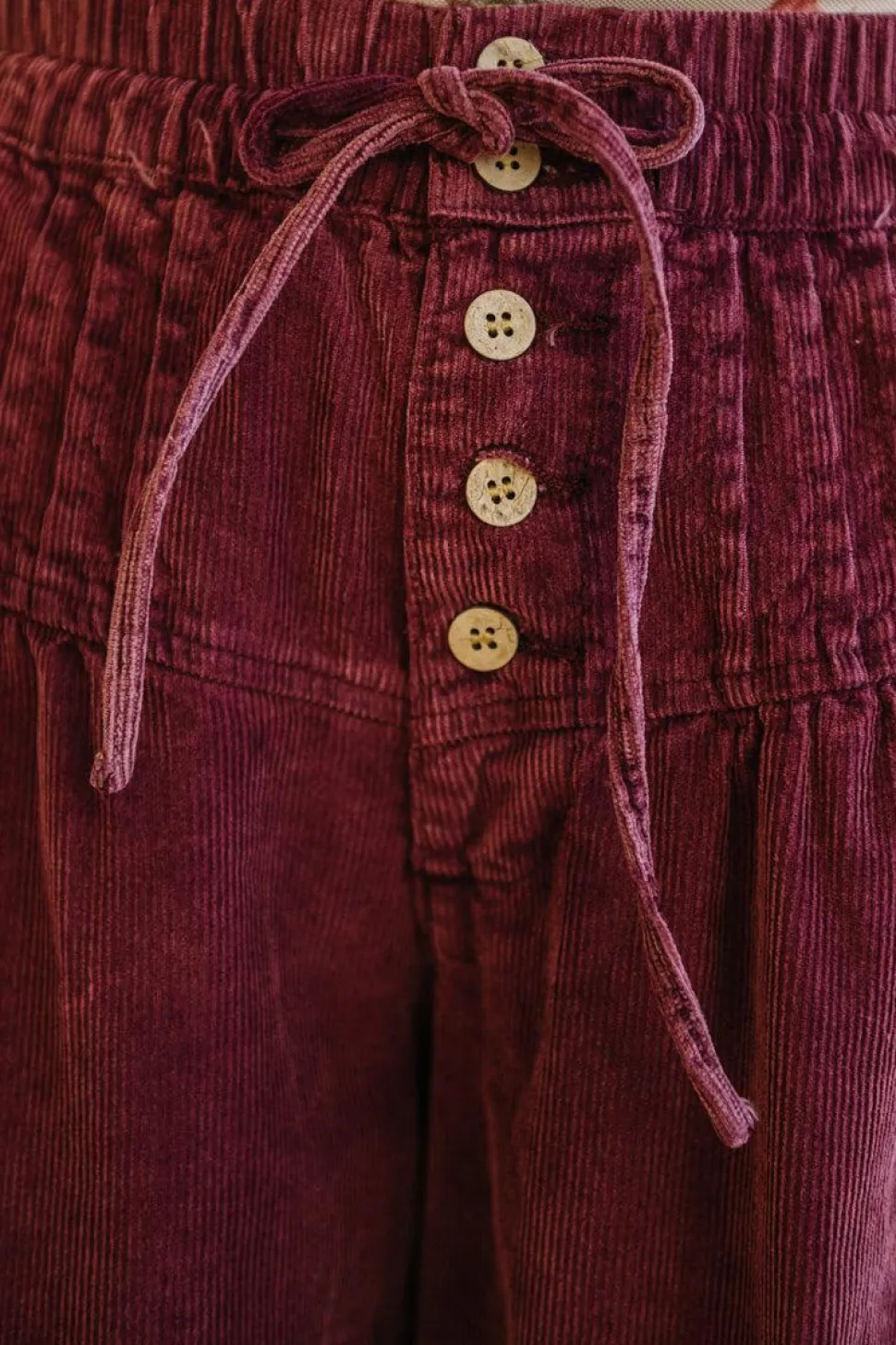 The Betty Pants are that rare mix of relaxed and refined. Made from 100% cotton, mineral-washed corduroy, they have a worn-in vintage vibe with thoughtful details—pin tuck seams, button-front styling, and a wide-leg silhouette that moves. The elastic waist and adjustable drawstring make them ultra wearable (aka Thanksgiving-dinner approved), while the deep pockets mean you can actually leave your bag behind.