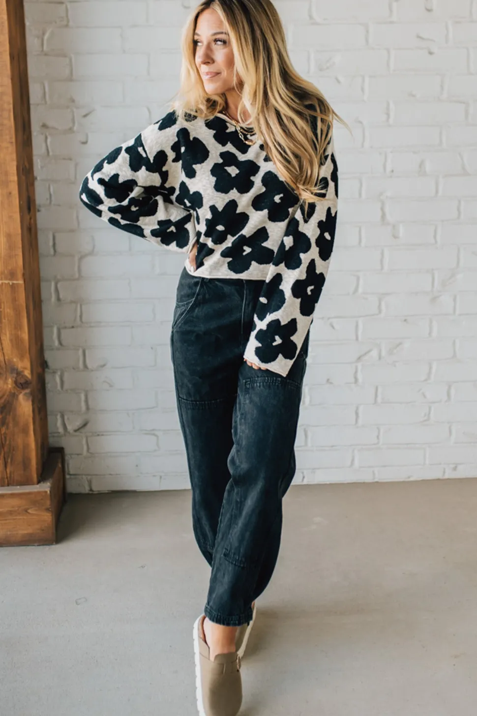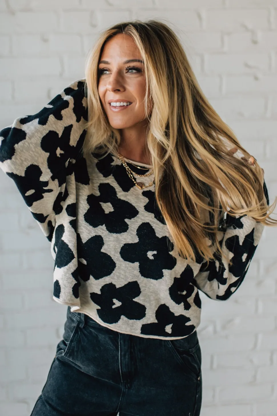 - Loose fit flower lightweight sweater top, featuring a bold cream background with a black oversized daisy weave – makes a statement without screaming for attention.