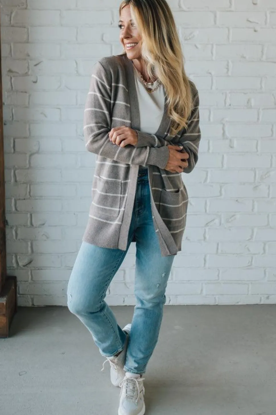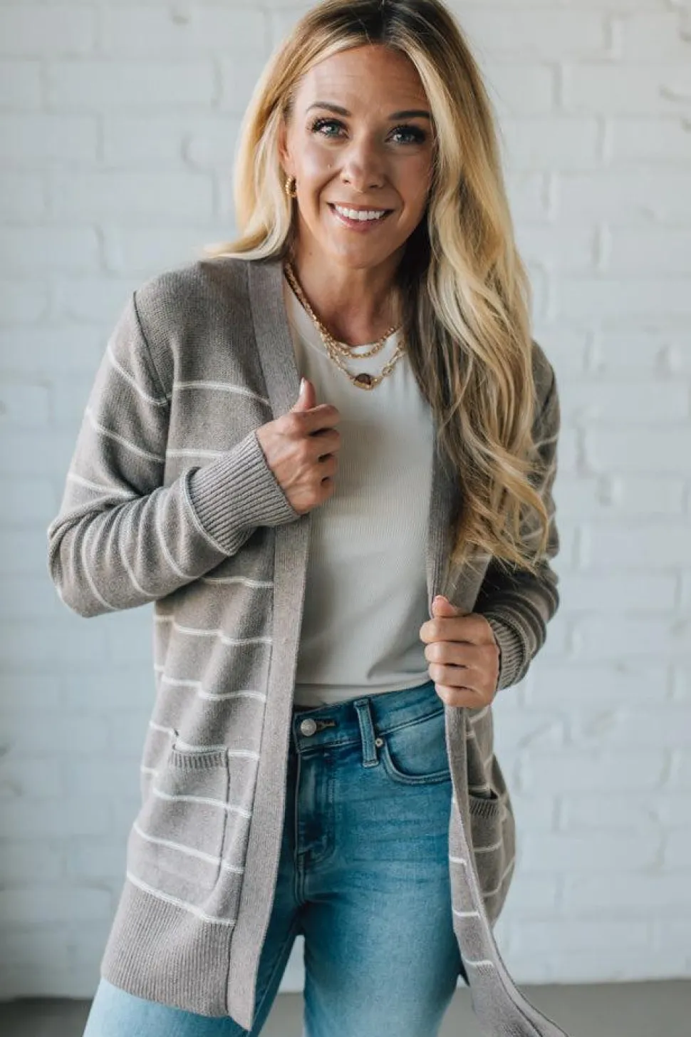 Picture this: you, coffee in hand, strolling into your favorite café wrapped in the soft hug of mocha and cream stripes. The Bobbi Cardigan is that easy, “throw on and feel put-together” layer that turns even a grocery run into a cozy style moment. Crafted in a soft, medium-weight knit, this open-front cardigan drapes effortlessly, giving you that lived-in warmth without bulk. The mocha and cream stripes add a modern, neutral pop, while the patch pockets keep your hands toasty (or hold your phone when you’re hands-free latte-carrying).