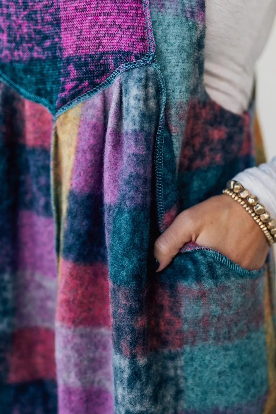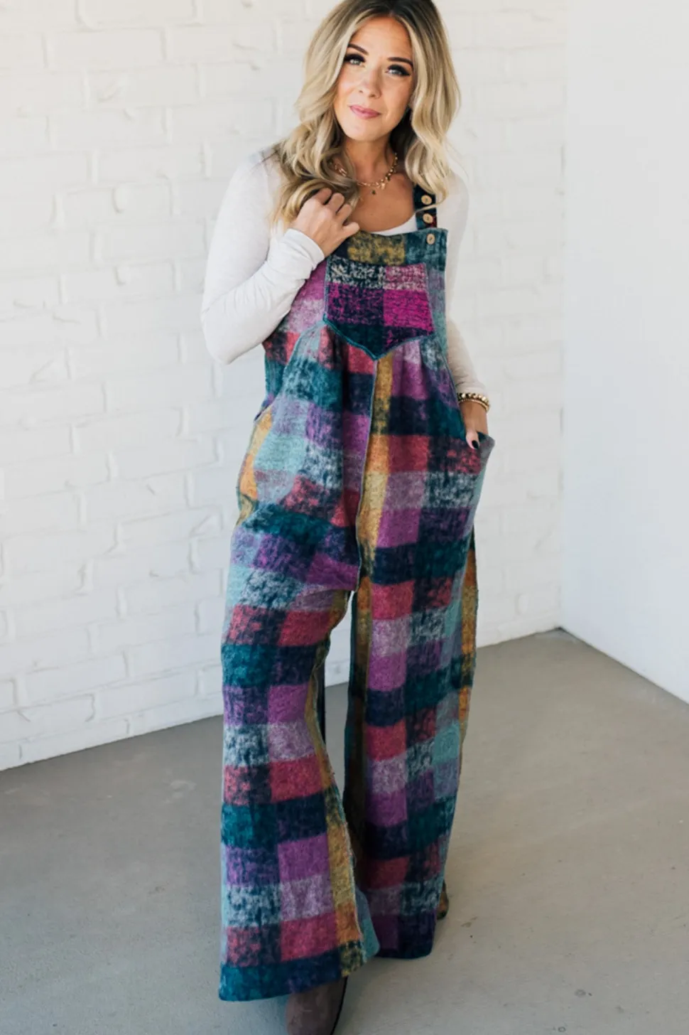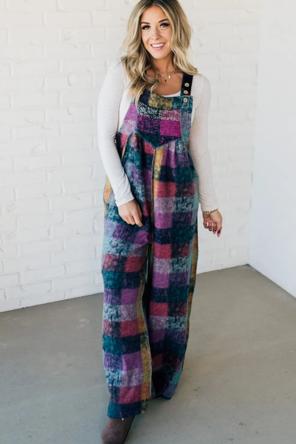 Add some sass to your wardrobe with our Brushed Multi Check Overalls! These soft and cozy overalls feature a playful multi-color plaid pattern and ultra-wide leg fit. The adjustable button straps make for a customizable and comfortable fit. A perfect addition for those looking to make a statement (and stay warm!) this season.