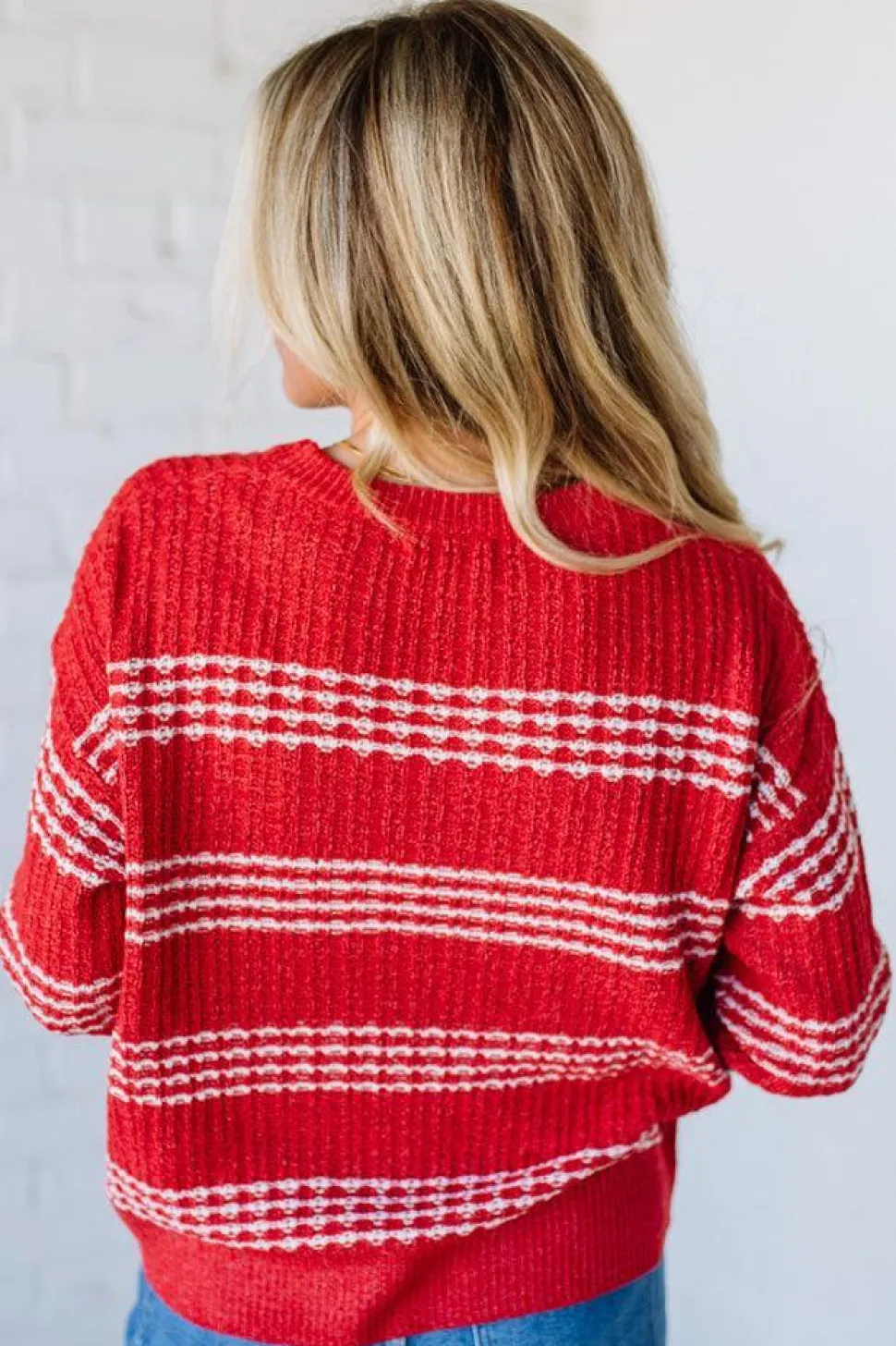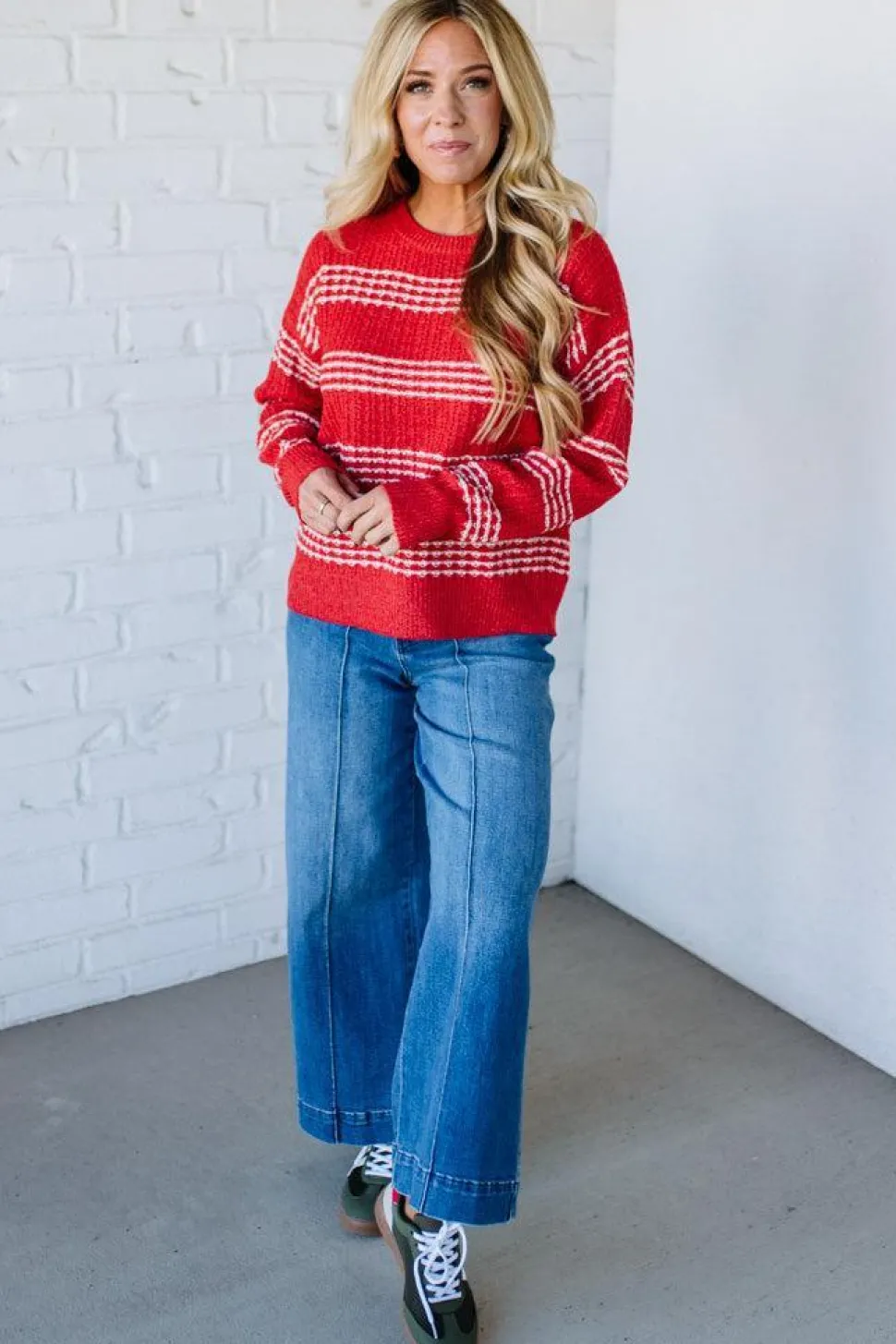 Pro styling tip: The bold striped pattern does the heavy lifting, so keep bottoms and accessories simple and neutral to let the sweater be the star without overwhelming your look.