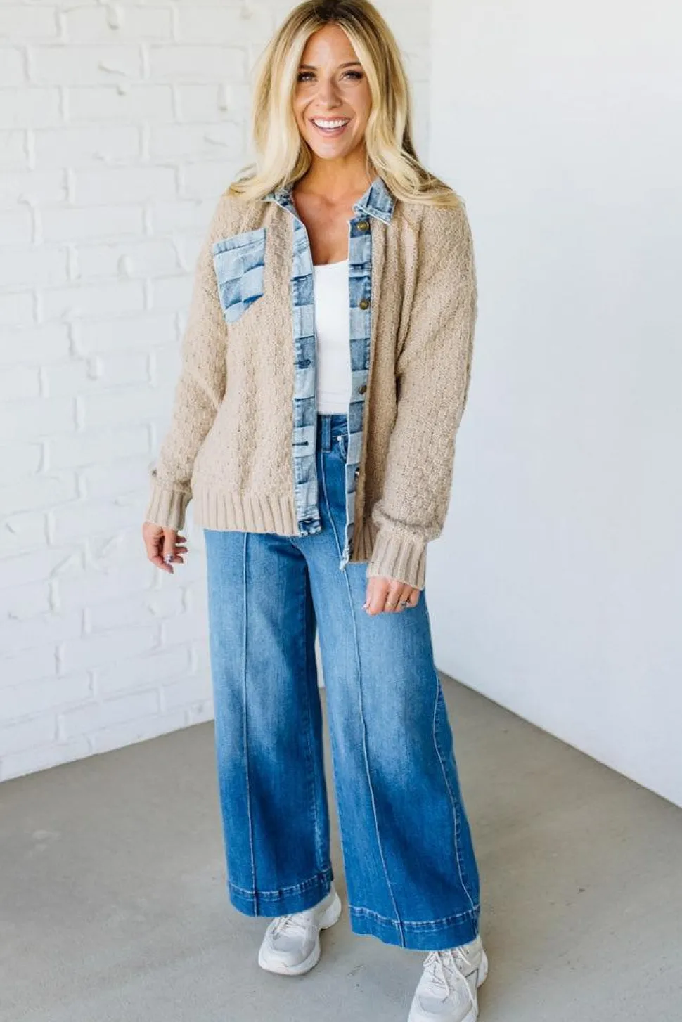 - Washed checker denim trim along the placket and pockets adds visual interest and structure, transforming a simple cardigan into a statement piece that stands out from basic neutrals