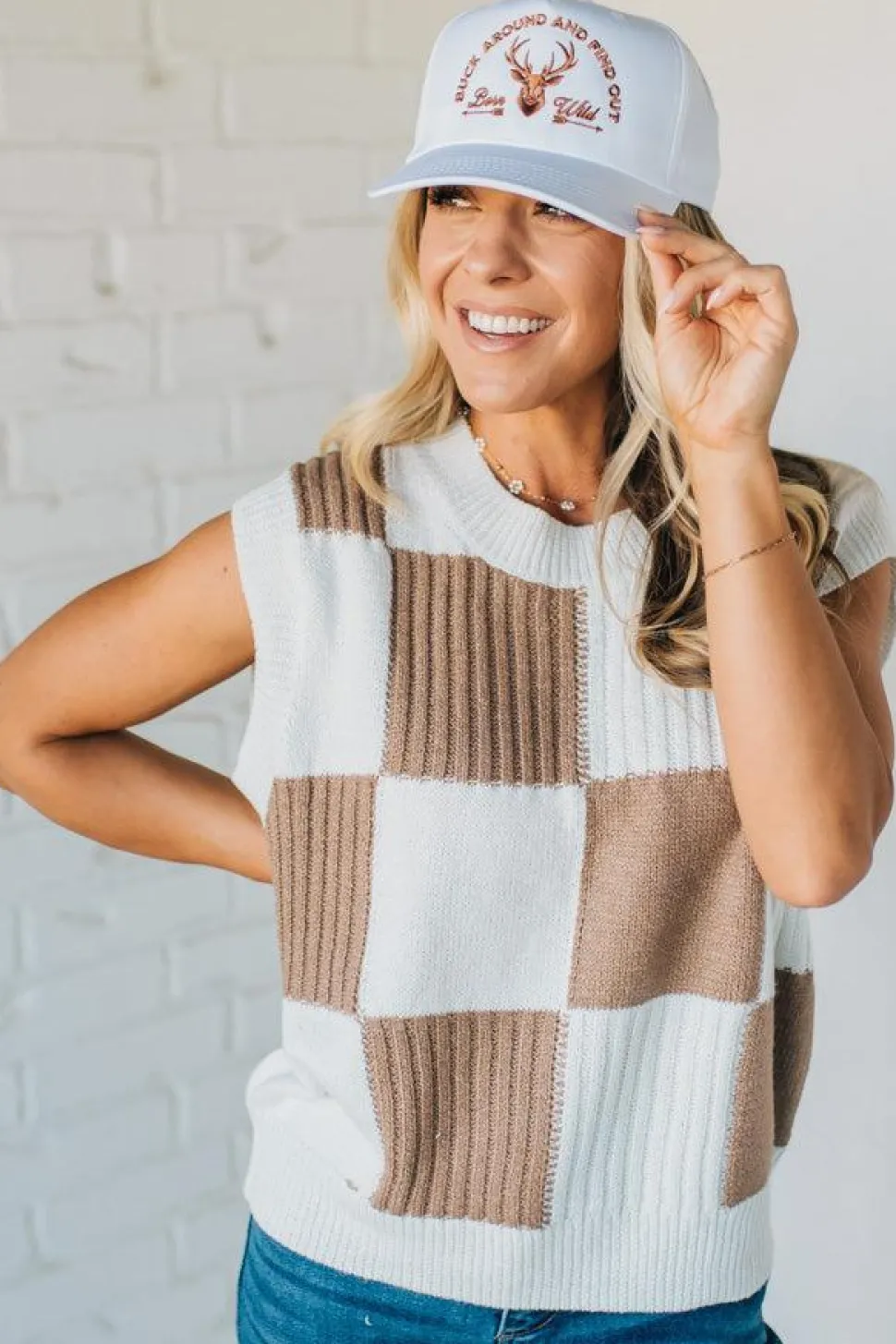 The sweater vest you didn’t know your wardrobe needed. 🤎🤍 This mocha and white checkered knit is playful yet polished—perfect for coffee catch-ups, layering over crisp shirts for the office, or going casual with denim on weekend game days. Crafted from a soft, slightly stretchy blend (76% acrylic, 20% polyester, 4% spandex), it’s cozy without being bulky. Wide shoulder straps give it a modern edge, while contrast ribbing around the neckline and hem keep it structured and chic.