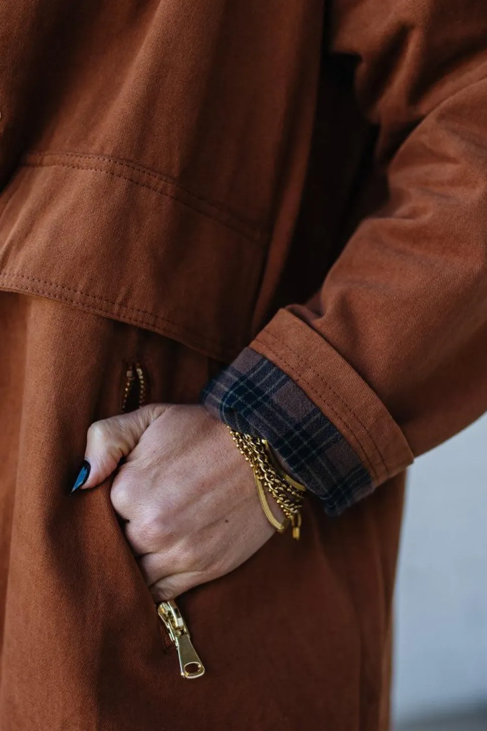 - Brown tartan plaid lining on the inside and sleeves adds warmth and a touch of pattern that stays hidden until you roll the cuffs or leave the jacket unbuttoned.