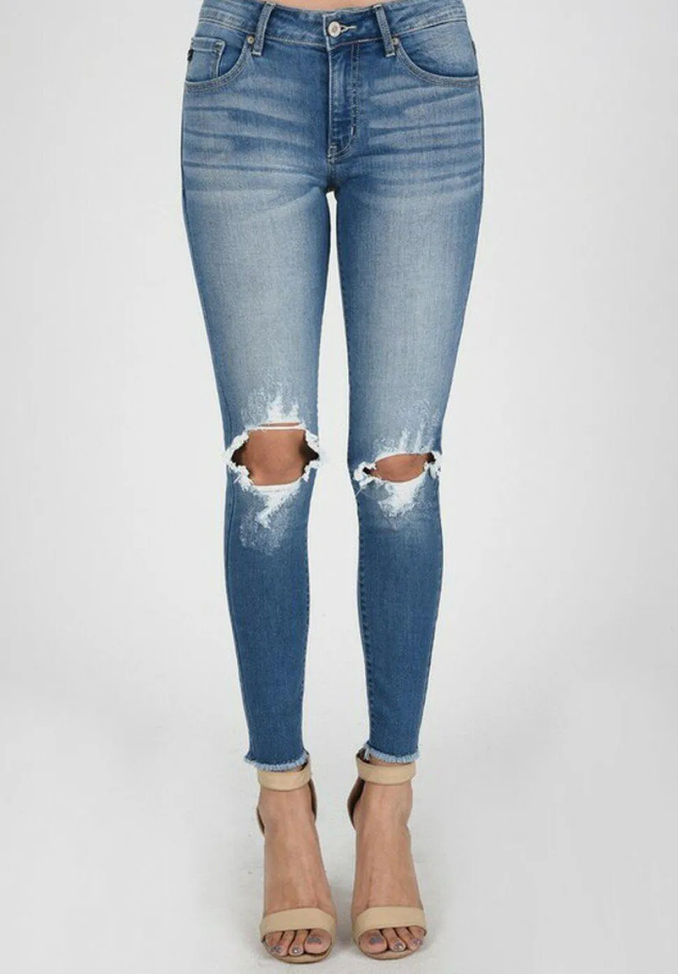 These are the ultimate pair of distressed skinny jeans to add to your rotation! The heavy distressing in the knee is perfectly complimented with the raw edge on the cuff. All coming together in one easy to wear pair of medium wash jeans!