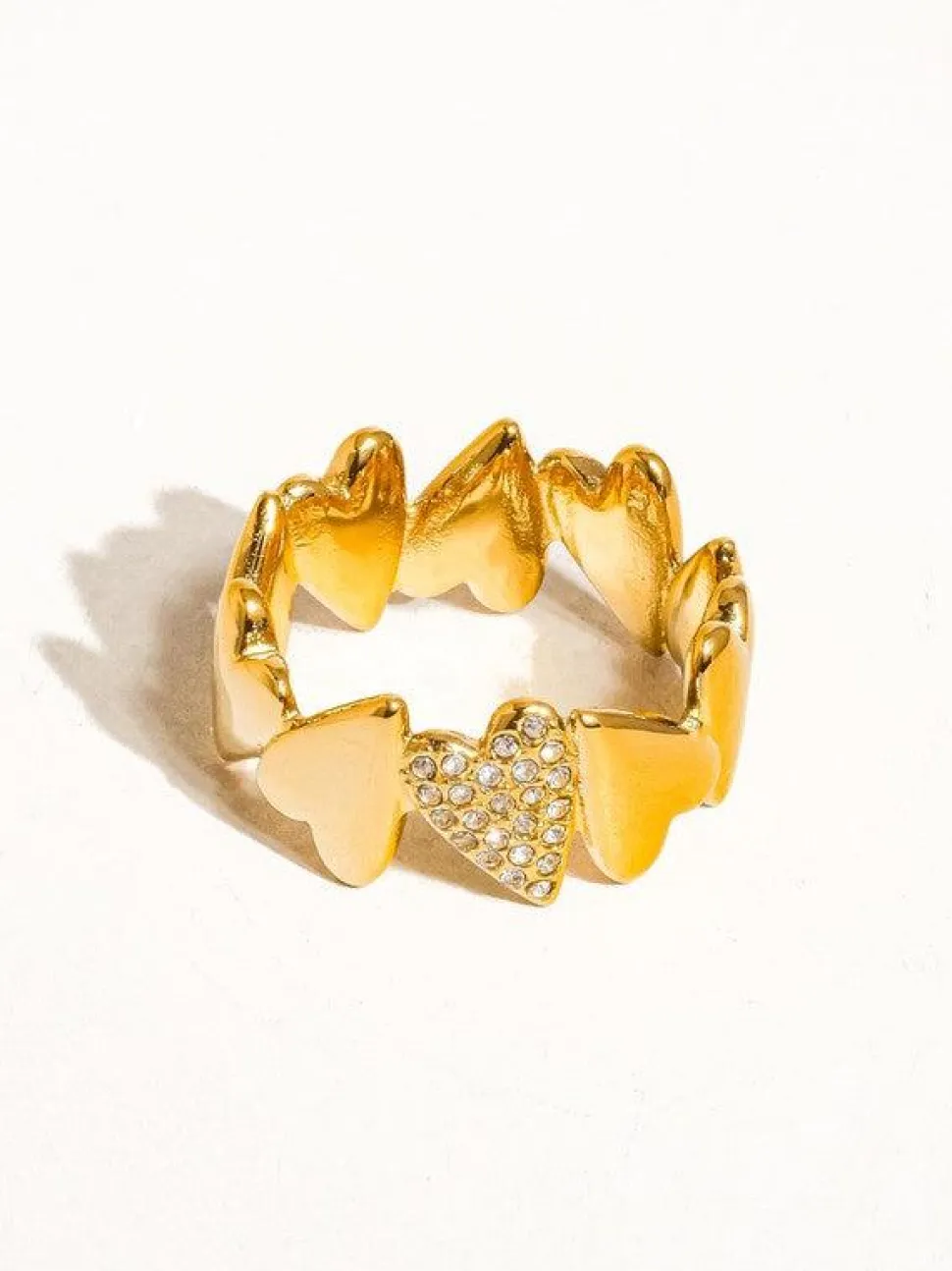Fall in love with the LUXE Crusted Heart Ring, featuring a row of charming hearts. This unique and playful ring will add a touch of whimsy to any outfit. Hearts that will steal your heart!