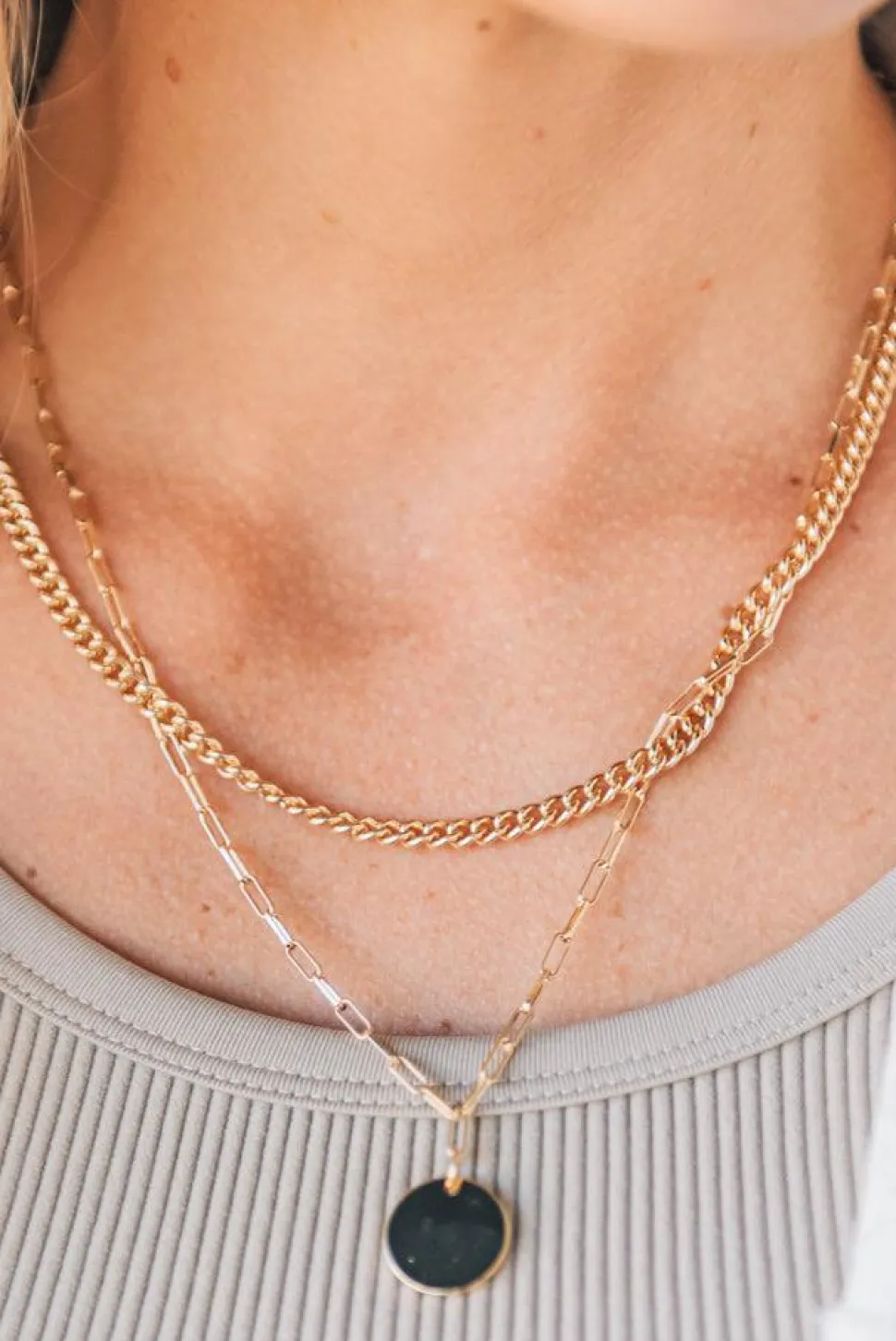 Two row curb chain and delicate link chain with disk pendant necklace.