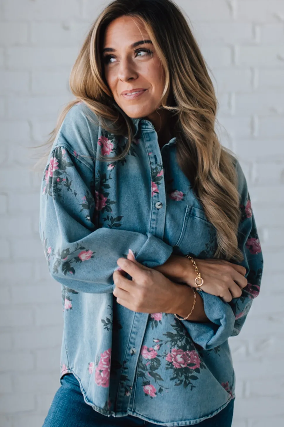 Add a dash of fun to your wardrobe with our Floral Print Denim Top. This playful and quirky shirt features a colorful flower print, and is made with lightweight denim fabric for comfort. With a button-up design, it’s perfect for any casual occasion. (Seriously, who doesn’t love a good floral print?)