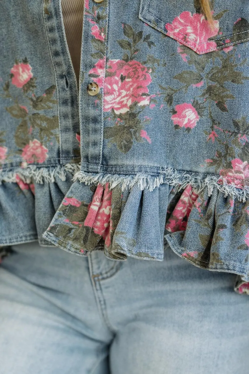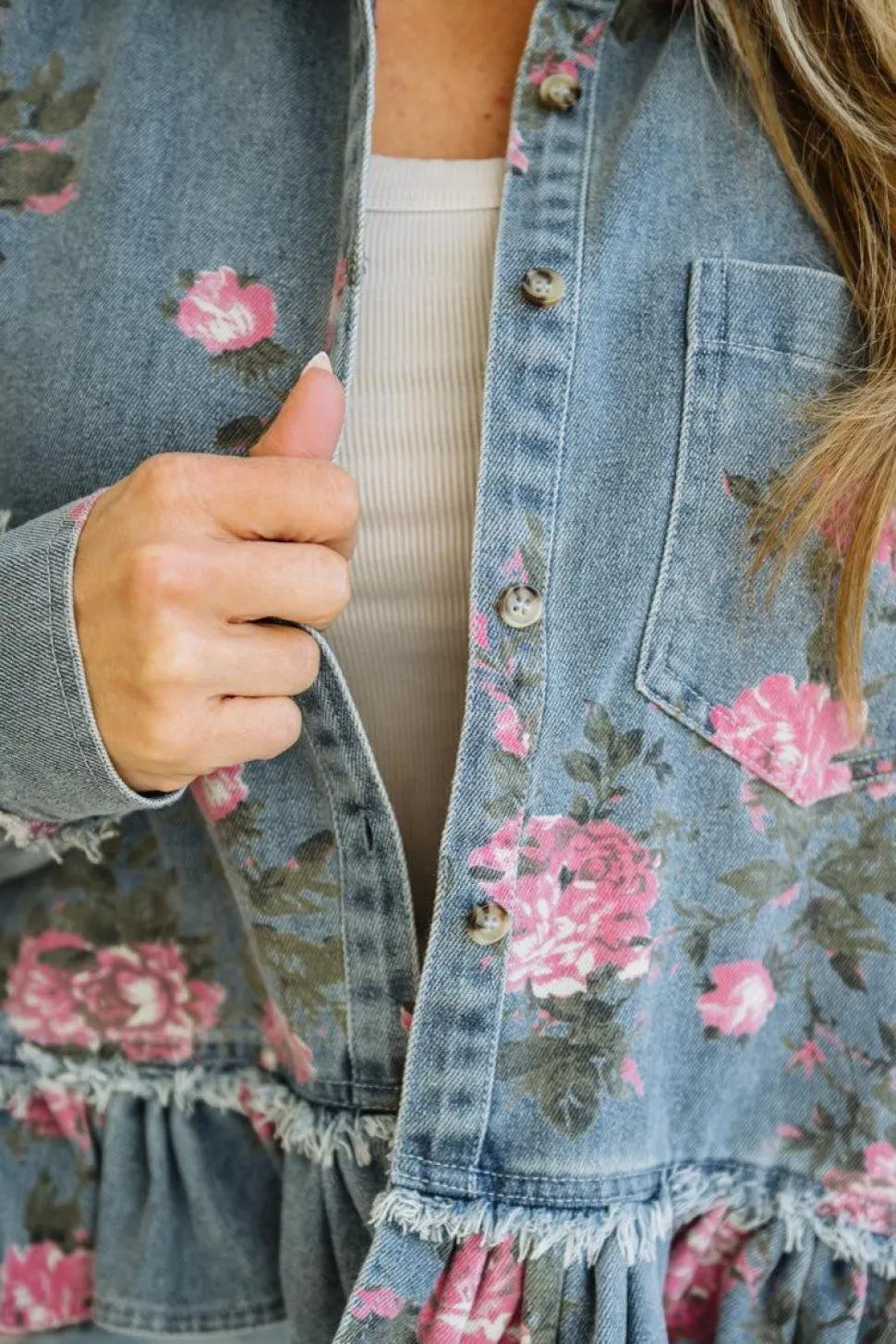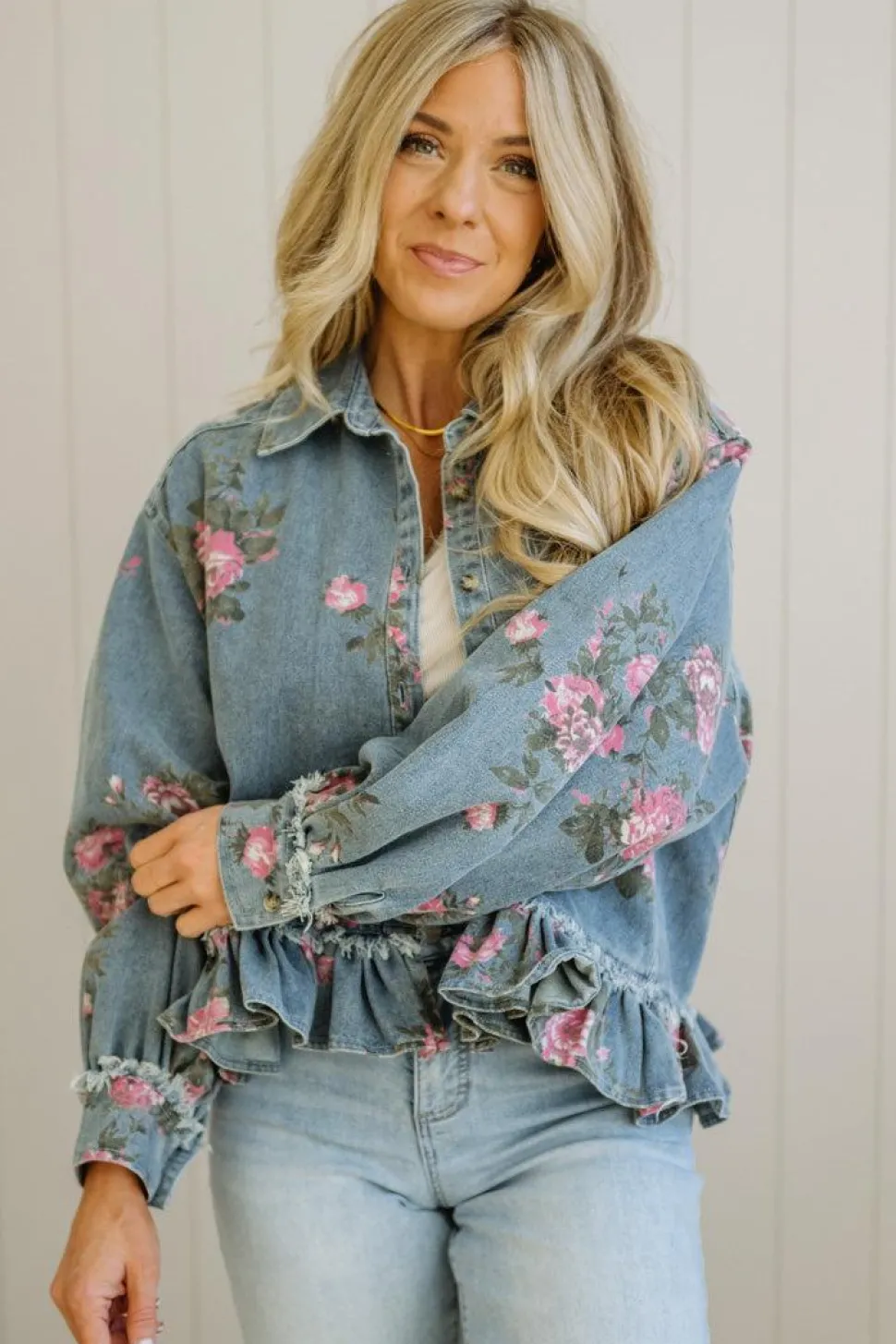 The Floral Print Ruffled Denim Jacket is your spring-meets-denim dream. Lightweight and washed to that just-right vintage blue, this 100% cotton jacket features an allover floral print that feels like a modern take on your favorite thrift-store score. The ruffled hem and cuffs add movement and romance, while the classic button-up shape keeps it grounded.