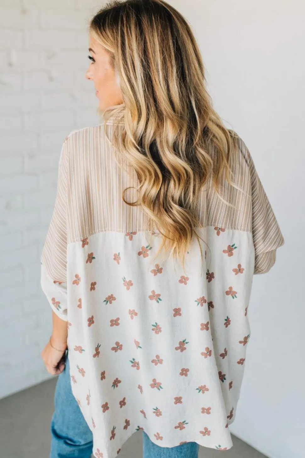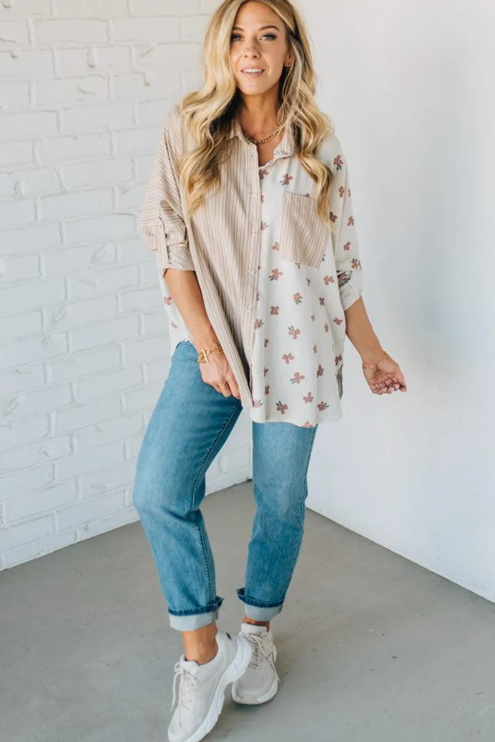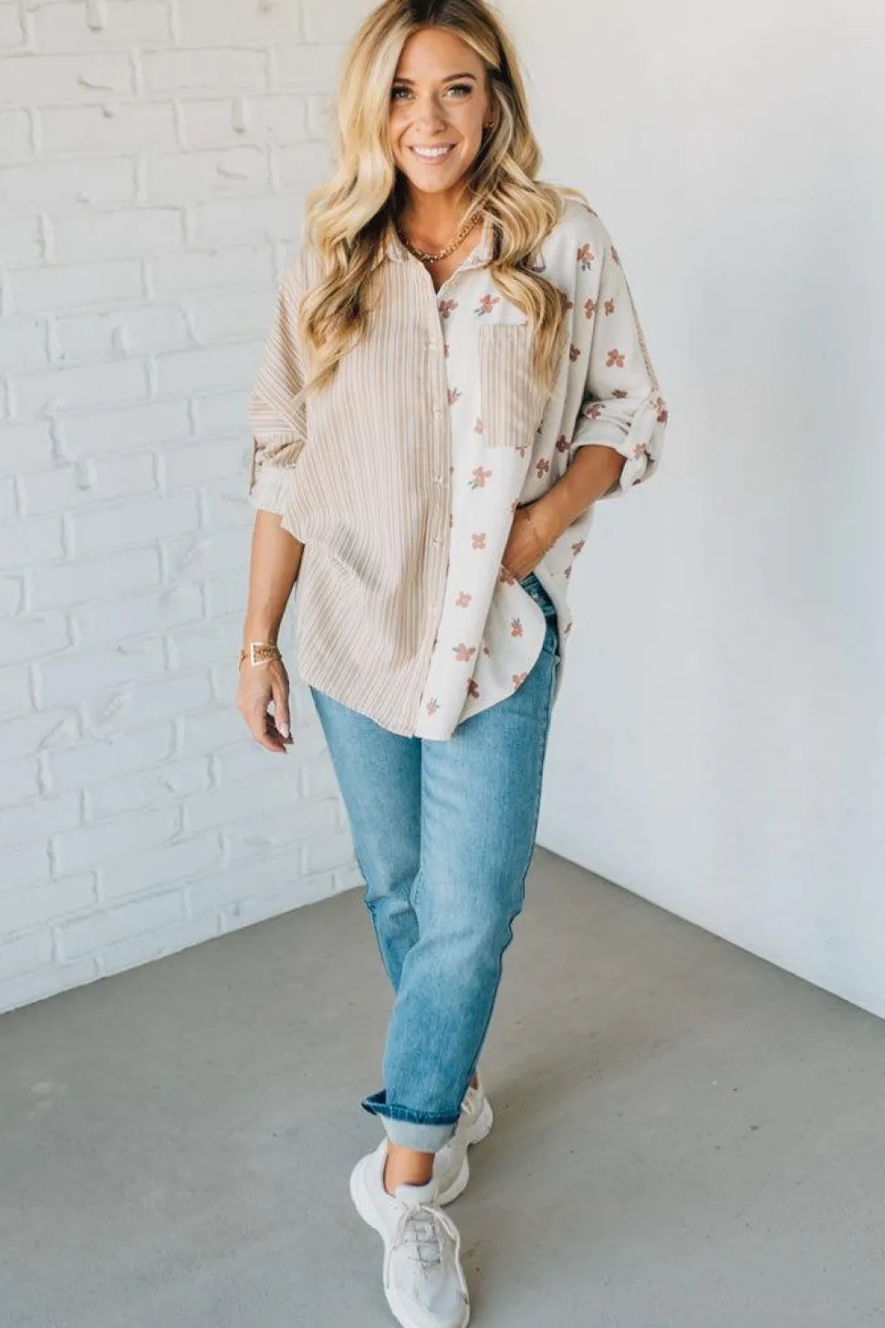 Shop the Floral + Striped Contrast Boyfriend Top at RubyClaire Boutique now – a versatile mixed-print piece that makes everyday dressing simpler and more stylish.