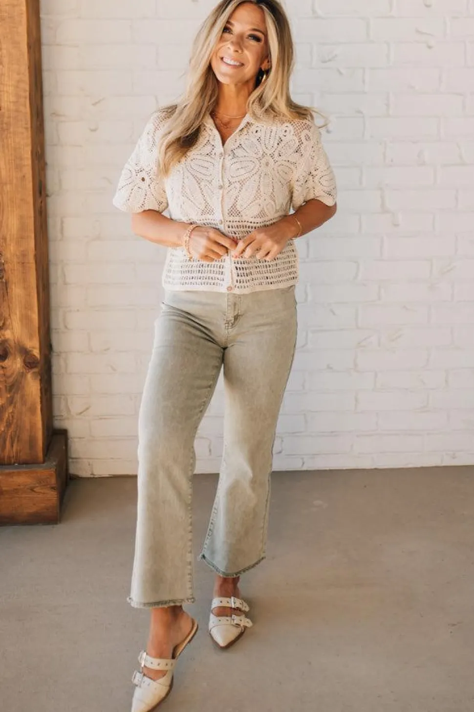Elevate your denim game with the Haddie Frayed Hem Jeans in Light Olive. These high waist bootcut pants feature a playful acid wash and frayed hems, adding a touch of edge to any outfit. Get ready to turn heads and make a statement! (No more boring jeans for you!)