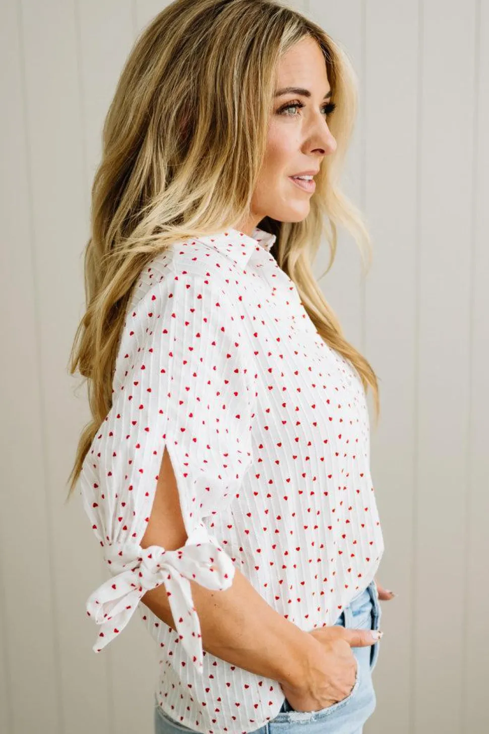 This is the Valentine’s Day top that doesn’t scream “theme”—but still makes hearts flutter. The Hearts and Bows Button Front Top takes a classic menswear silhouette and sweetens it up with tiny embroidered hearts, puff sleeves, and flirty side-tie bows.