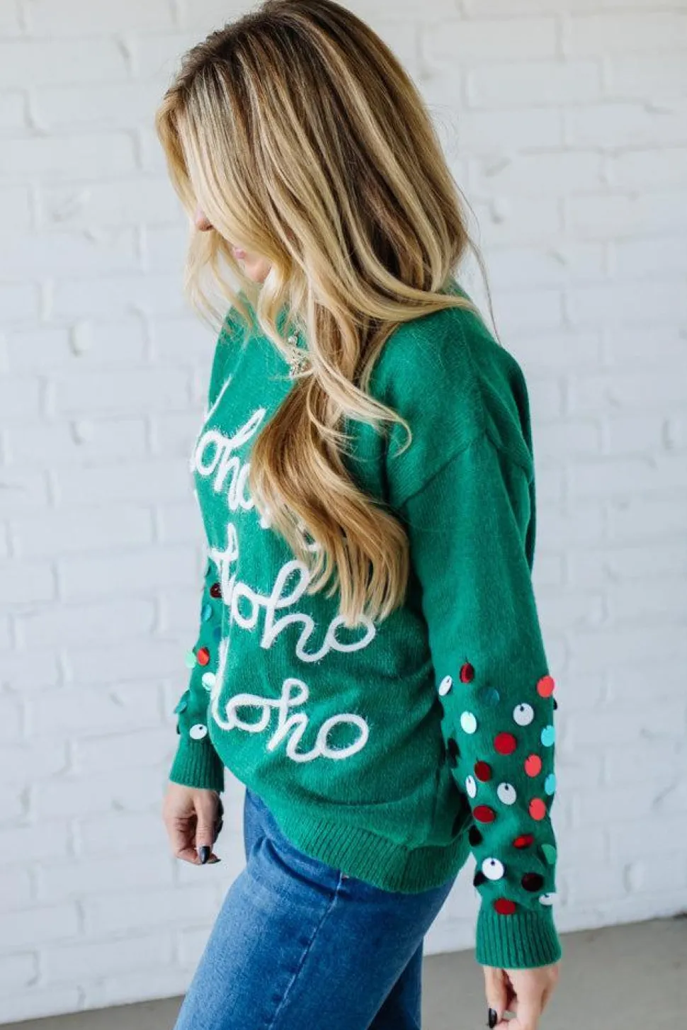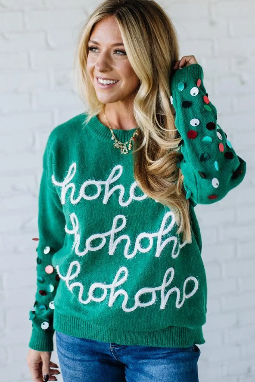 - Self: 100% Polyester | Spangled sleeve with slightly tilted tinsel ho ho ho lettering Christmas sweater | Drop shoulder construction | Large sequins on sleeve from elbow to wrist