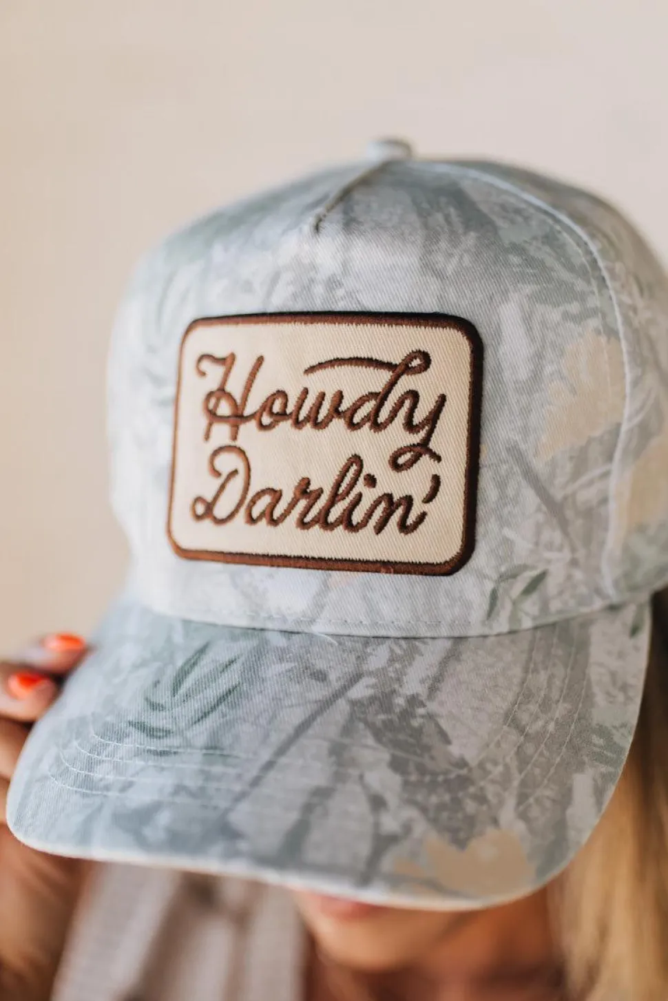 Add some country charm to your outfit with the Howdy Darlin Hat. Featuring a Realtree camo print and a playful “Howdy Darlin” embroidery patch, this 5-panel structured trucker hat is made from 100% cotton for comfort and style.