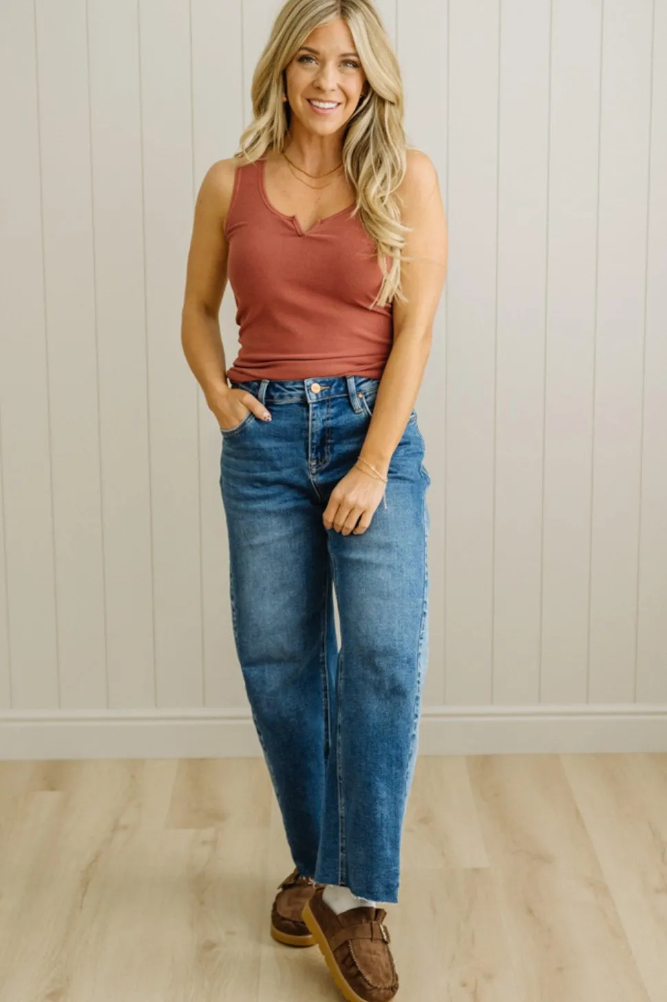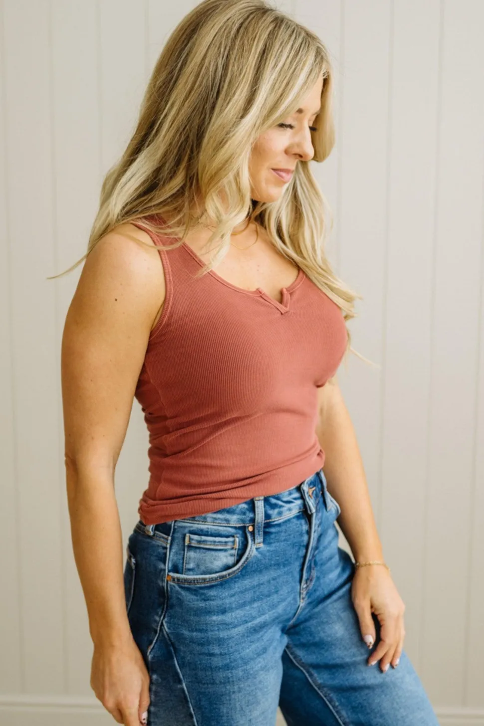 Crafted from a breathable ribbed rayon-spandex blend, it hugs just right without clinging, and the notched neckline adds a little visual interest to your usual tank rotation. High enough for great coverage, fitted enough to feel polished, and comfy enough to nap in.