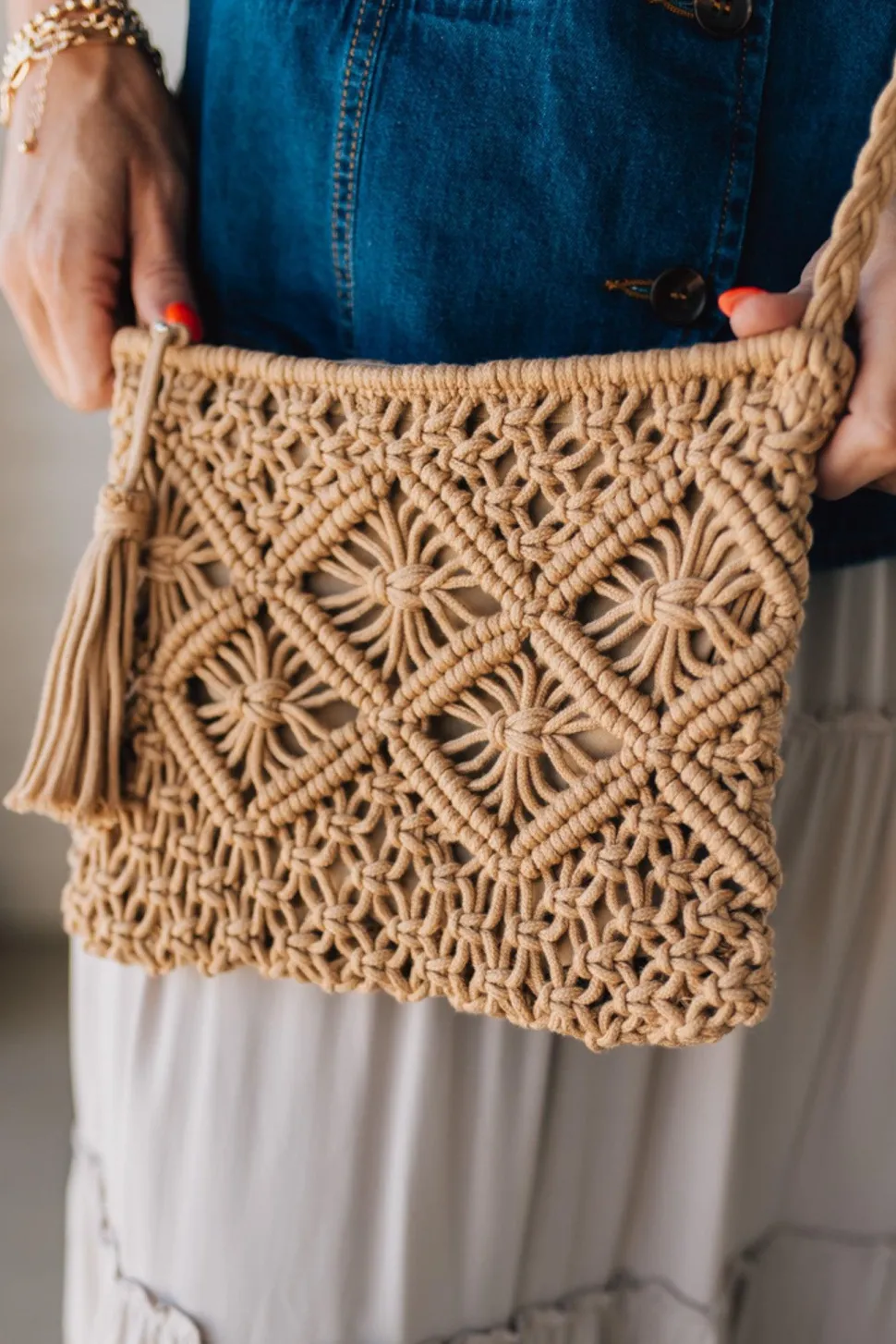 Add some boho flair to your style with the Jonah Macrame Crossbody Bag. Featuring a macrame woven design and tassel accent, this bag is both trendy and unique. The cotton linen lining and interior open sidewall pocket make it functional, while the zip top closure keeps your belongings secure.