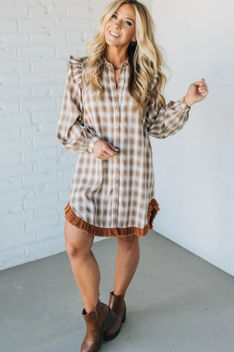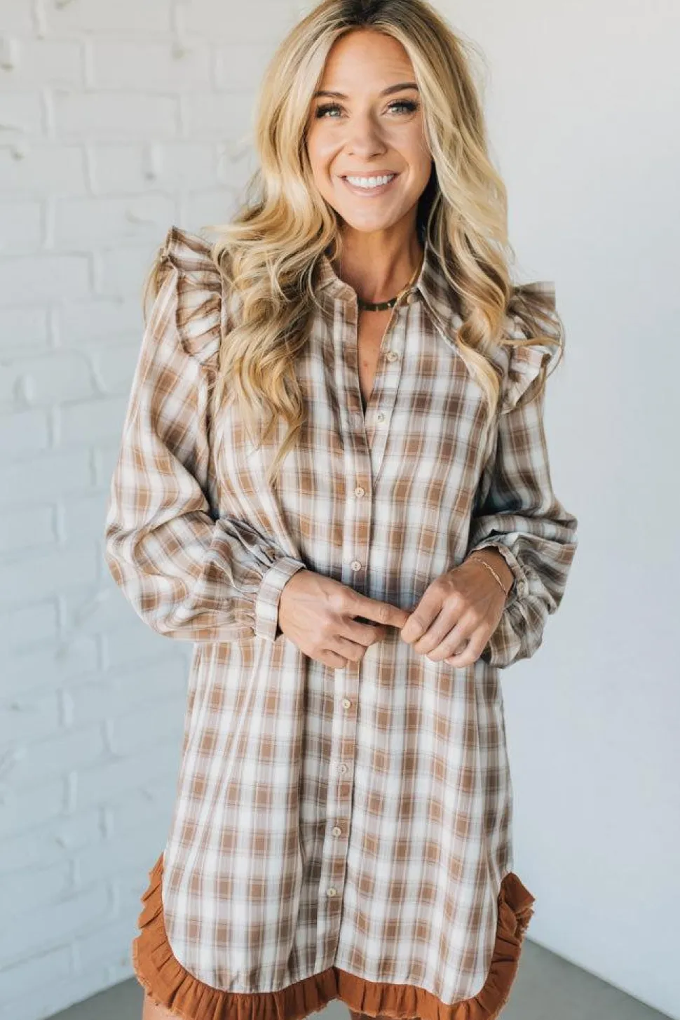 She’s part prairie romance, part rodeo-ready, and fully made for fall. The Jonnie Plaid Ruffled Accent Shirt Dress brings a soft, flirty spin to classic country with its lightweight drape, high-low hemline, and contrast ruffle trim that adds just the right twirl.Whether you’re heading to the pumpkin patch, rodeo night, or lining up for cider with the fam, Jonnie’s got that photogenic magic. Styled with boots and a hat? Swoon.