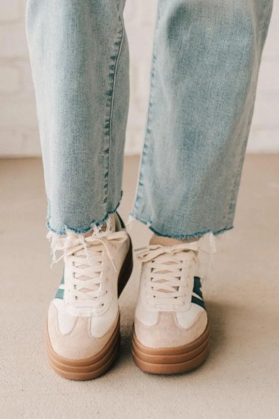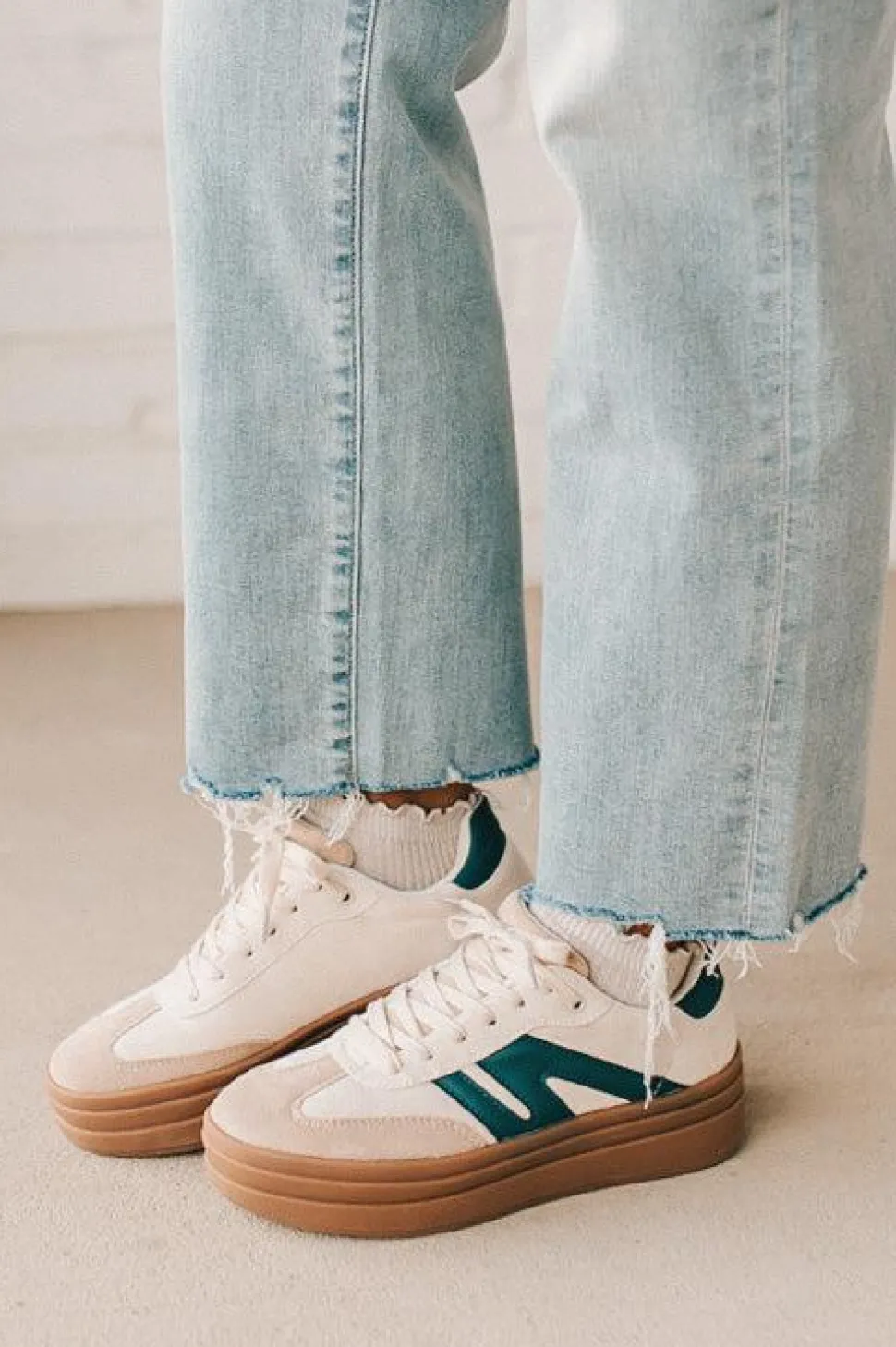Step up your sneaker game with the Kaity Double Stripe Sneakers. These light beige platform sneakers feature a playful pop of deep jade with a double stripe design. Comfort and style meet in the perfect combination. (Pair with any outfit for a quirky and fashion-forward look!)