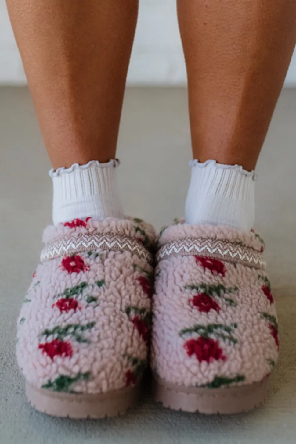 The kind of slippers that make you look forward to staying in. The Kay Cozy Floral Slippers wrap your feet in plush pink sherpa with sweet rosebud embroidery and just the right amount of puff. Finished with a chevron-knit trim and a slip-on design that makes every step feel like a warm hug.