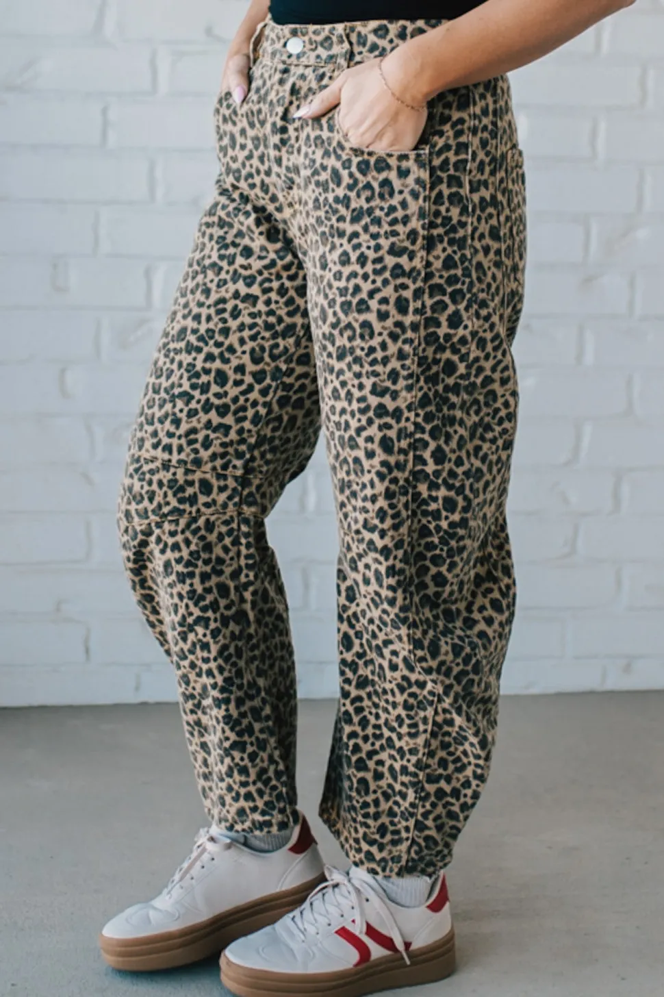 Unleash your wild side with our Leopard Barrel Jeans. These low-rise pants feature a fierce leopard twill fabric for a unique twist on traditional jeans. Embrace your inner fashion predator in style!