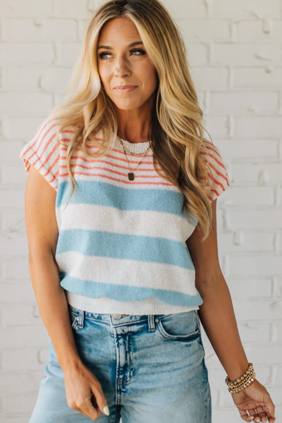 For when you want to look put-together but still feel like you’re wearing your favorite sweatshirt. This lightweight knit is soft, stretchy, and sneakily festive—with mini red stripes up top and soft blue ones down low, it gives a subtle nod to all things summer and celebratory. The dolman sleeves are rolled just right, the round neck keeps it classic, and the tapered waist makes it ultra-flattering (yes, even on “just coffee and emails” days). It’s texture-rich and crazy comfy—aka your new go-to for casual workdays, errand runs, and everything in between.