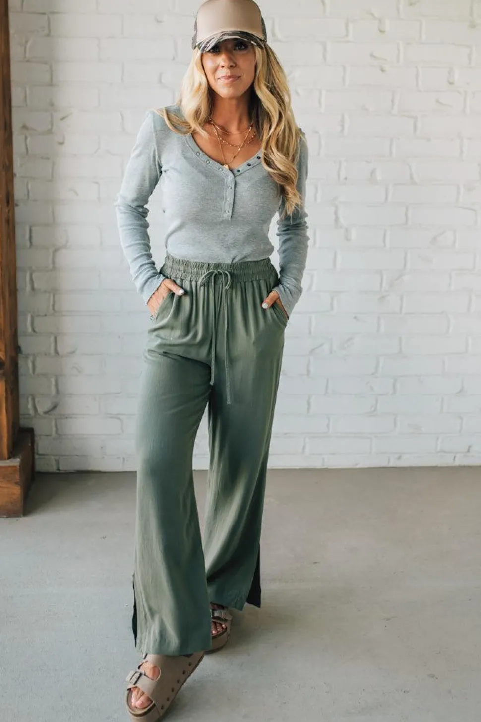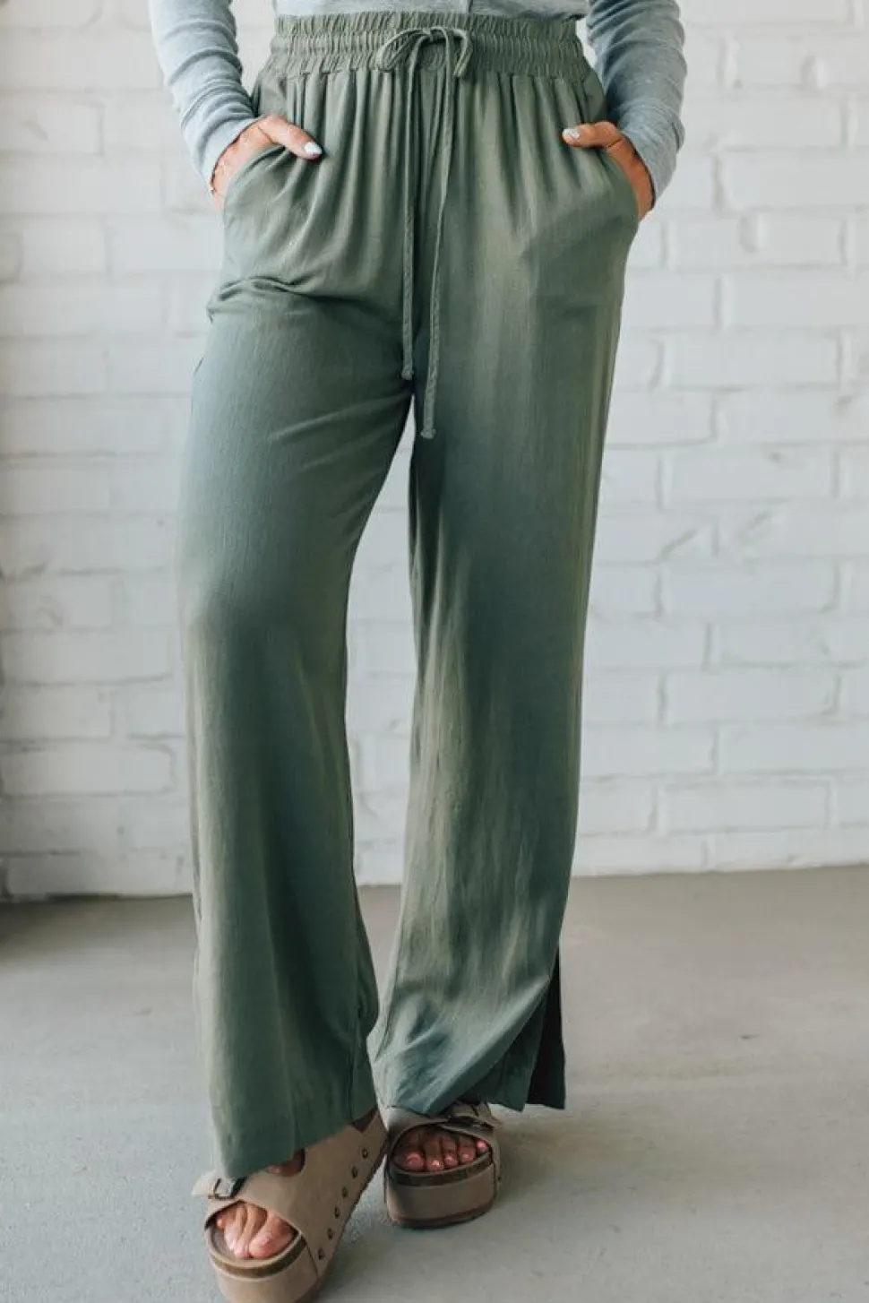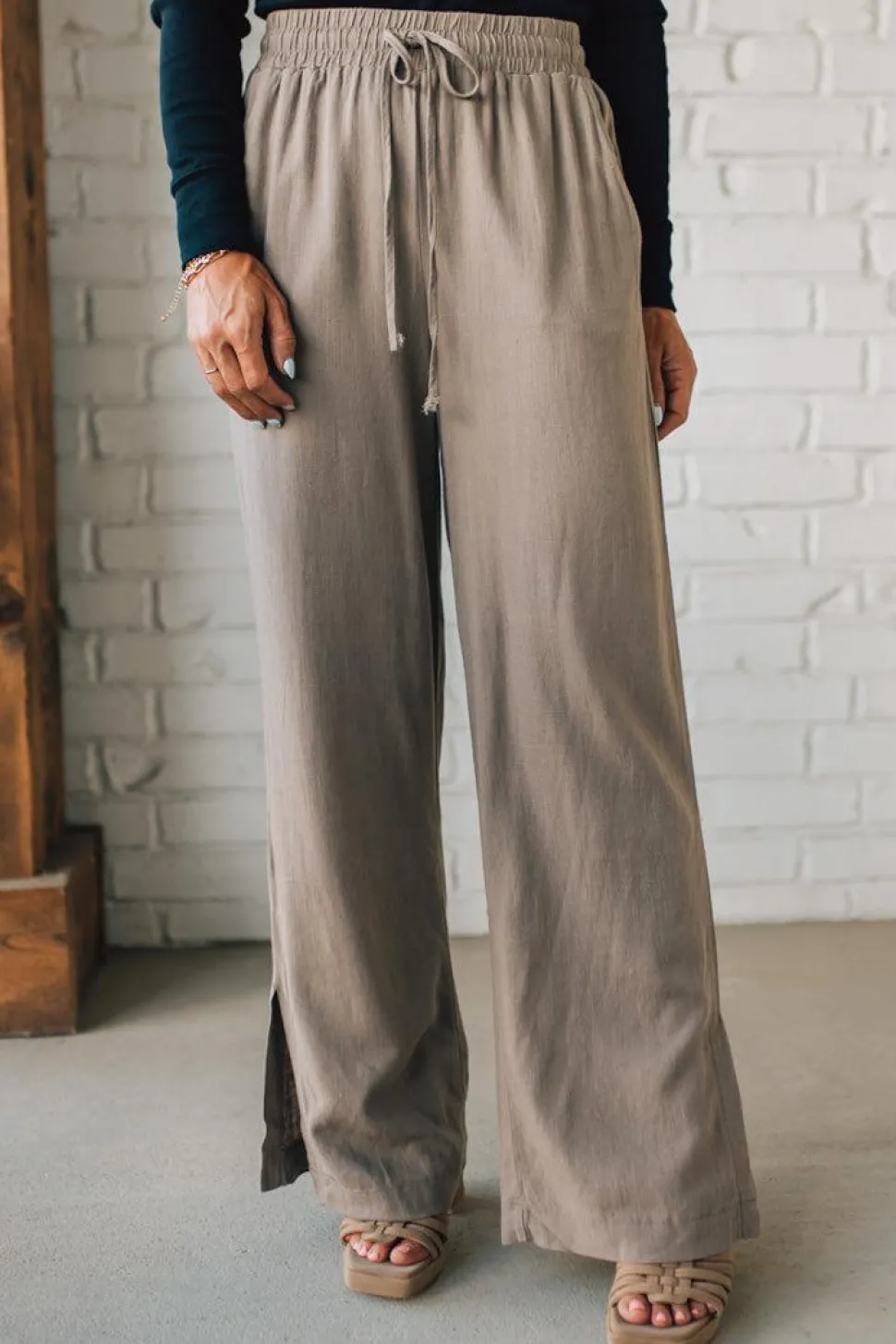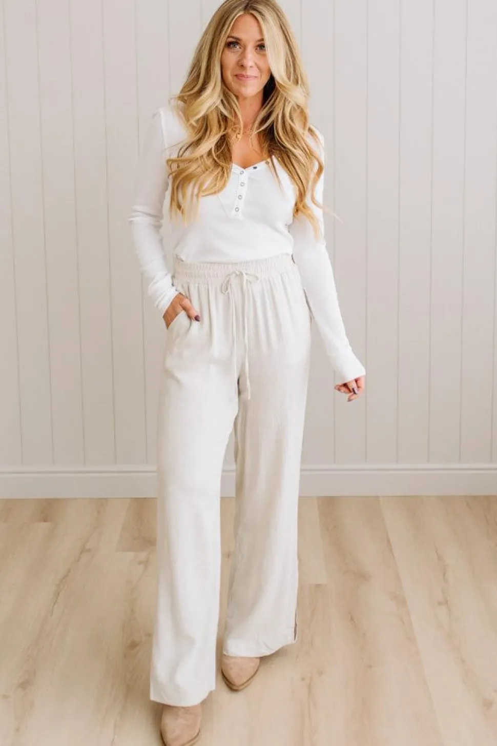 Made for Movement + Moments! Weekend mornings. Slow coastal strolls. That in-between season where the breeze has just the right chill. These are the pants you’ll wear on repeat—from the airport to the pumpkin patch. The Linen Blend Drawstring Pants are the definition of laid-back polish. Designed in a soft, breathable linen blend with a wide leg and subtle side slits, they move with you—never against you. The wide elastic waistband with drawstring lets you find your perfect fit, while deep pockets keep it functional (because yes, your phone should fit too).
