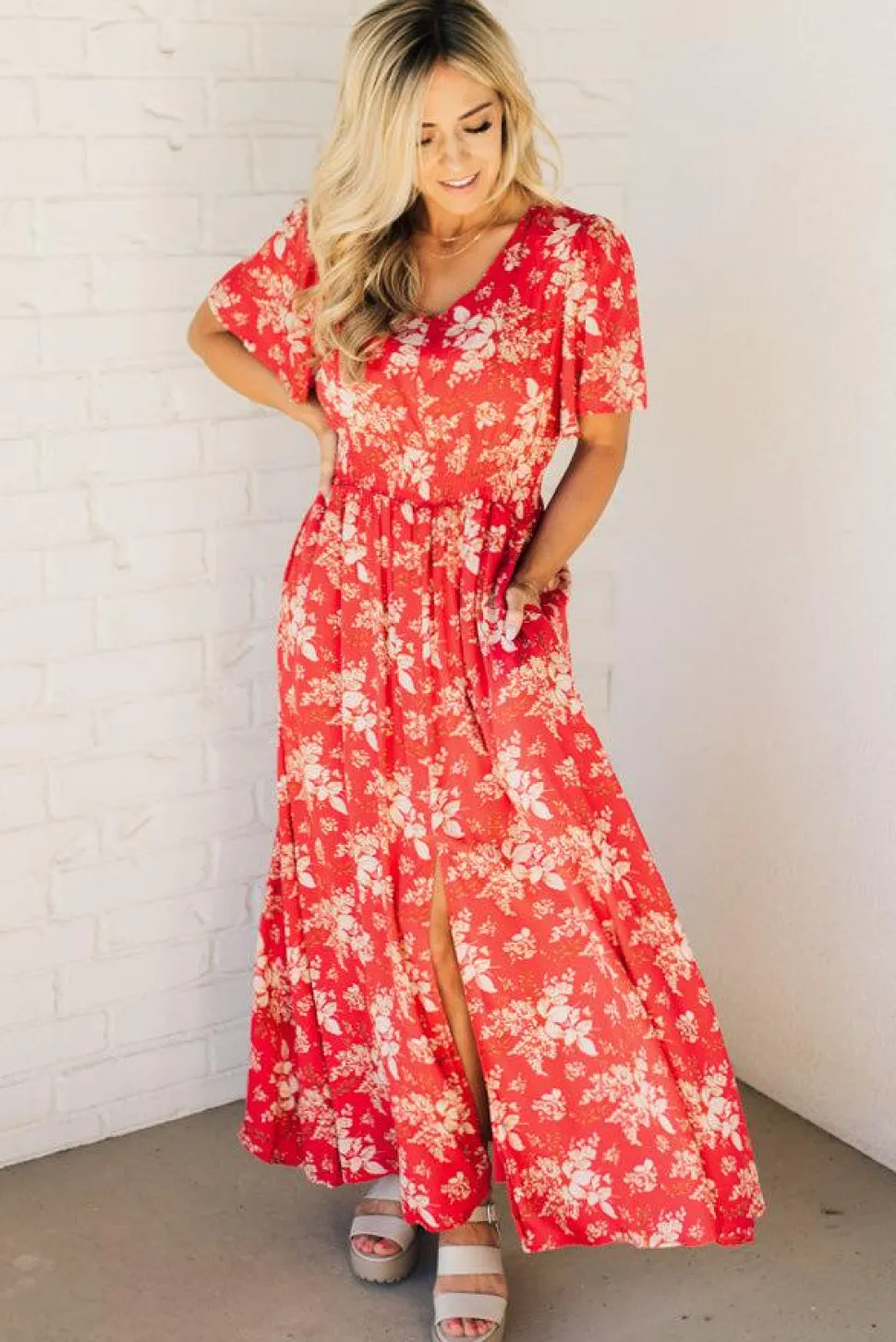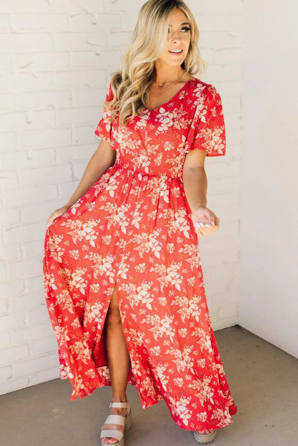 Pretty shade of bright red that we are dead over! This fun dress has a fully smocked waistline, with a center split front hem. The half, flowy sleeves are perfectly styled, and compliment the A-line shaped skirt of this beautiful dress!