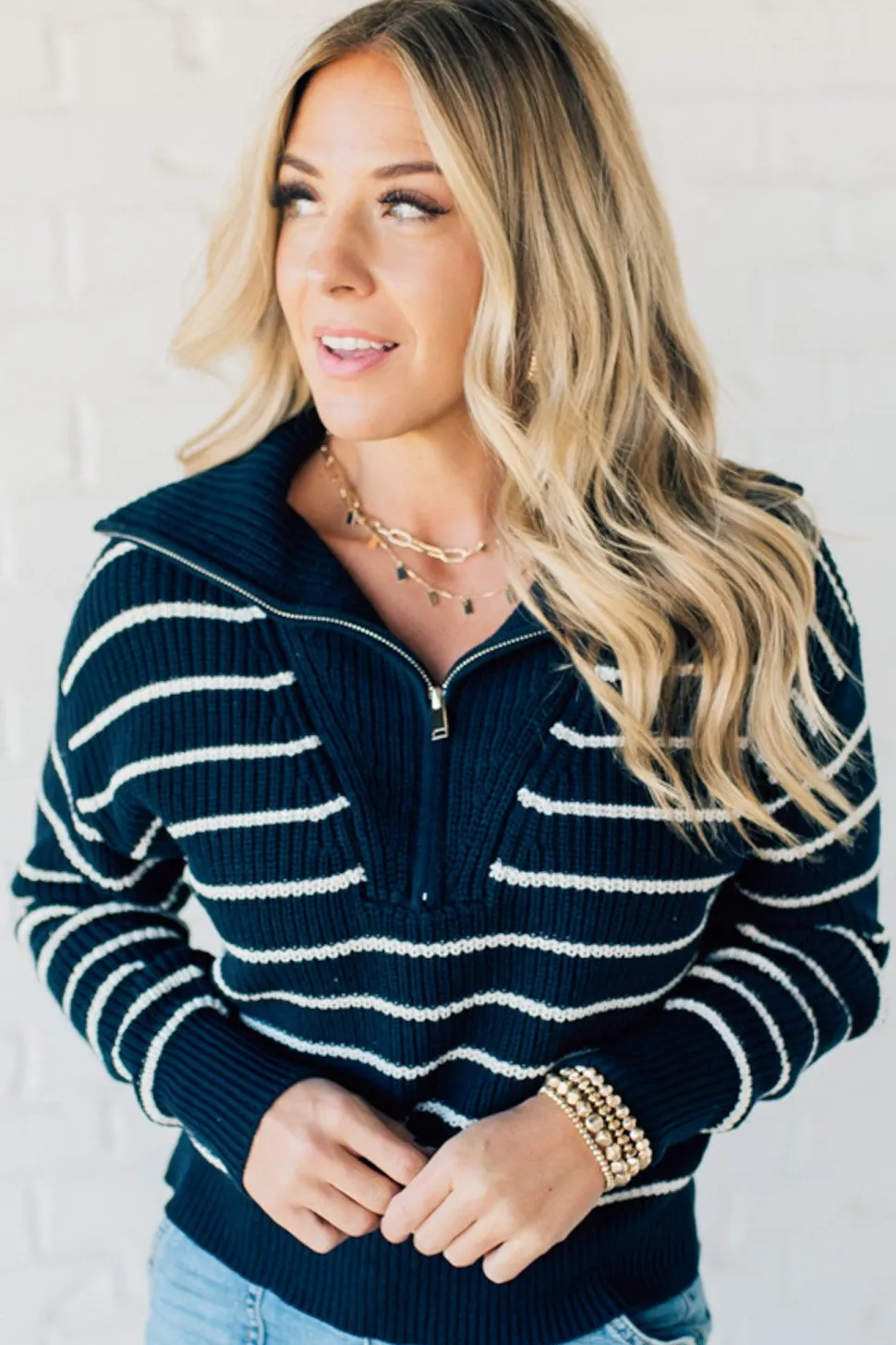 Get ready to strut your style with our Mary Striped Zip Henley Sweater! Featuring a flat lay collar and fine horizontal stripe weave, this sweater is both stylish and comfortable. The silver zipper henley adds a touch of edginess, while the tapered waist and drop shoulder create a flattering silhouette. Perfect for a playful and quirky look!
