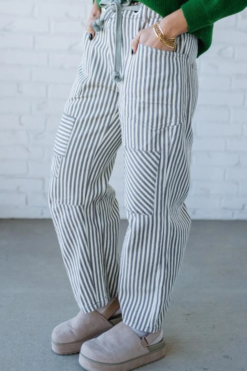 Made for girls’ days that drift into late brunches and “just one more shop” strolls. The Mia Striped Drawstring Barrel Jeans bring that playful vintage vibe with a modern ease—bold stripes on 100% cotton denim that already feels like your favorite pair.