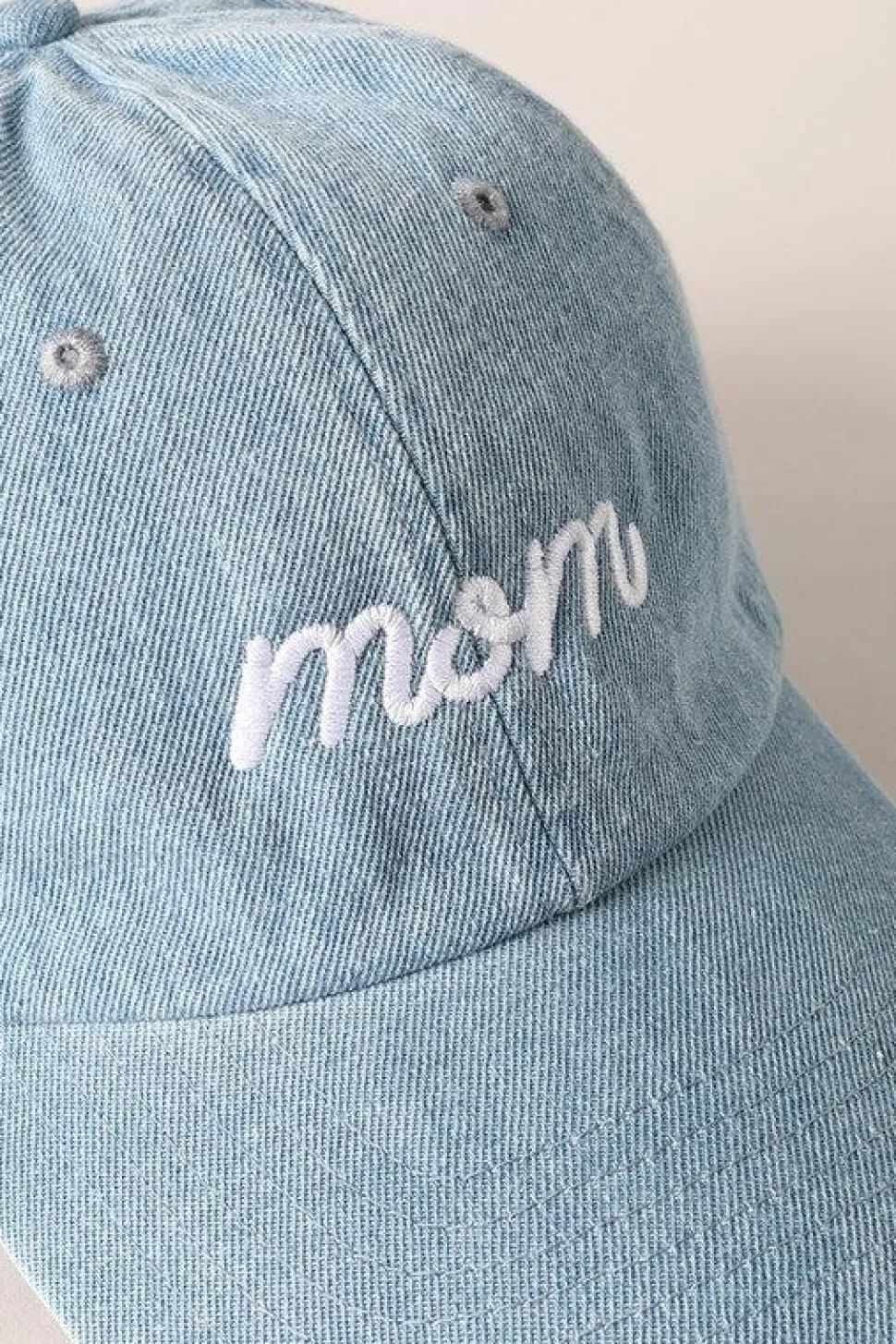 Show off your mom pride with our Mom Denim Hat! This playful 6 panel light wash baseball cap features an embroidered “mom” text design, adding a touch of personality to any outfit. Plus, the adjustable strap ensures a comfortable fit for all. Perfect for moms who don’t take themselves too seriously (just like you).