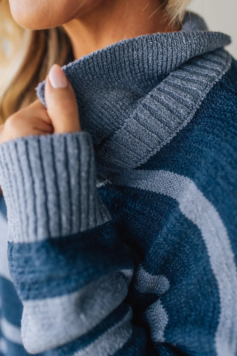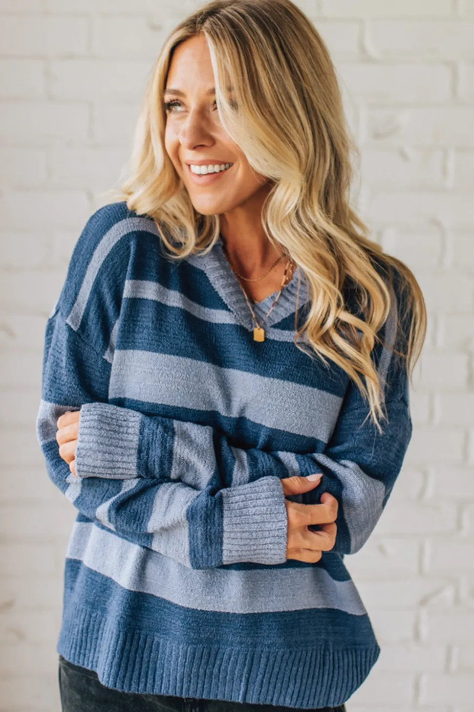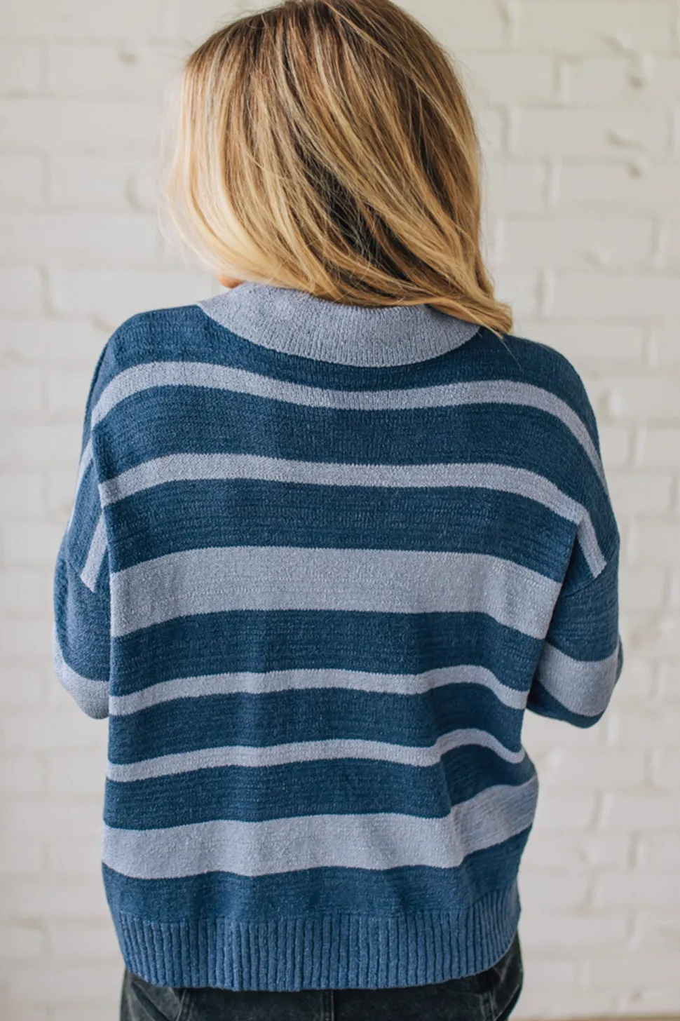 - Light and dark blue stripes add subtle contrast that pairs easily with denim or tailored pants, matching searches for “blue striped sweater” and “collared knit top.”