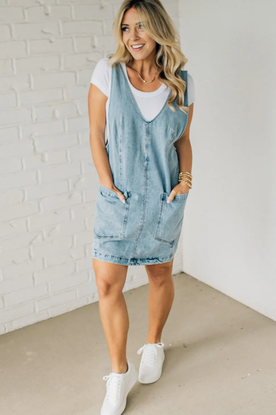 Get groovy in the Paisley Denim Jumper Dress! This acid washed denim dress features adjustable suspender straps for a customizable fit. Perfect for channeling your inner flower child with a touch of edgy style.