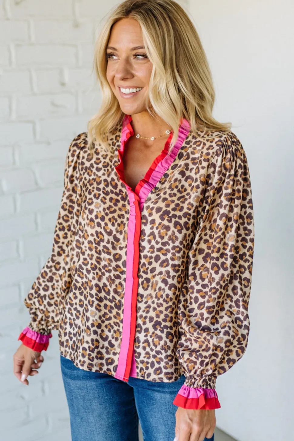 - Leopard printed top with red and hot pink striped wavy ruffle trim detail adds a fun pop at the neckline and cuffs, so you get a fashion-forward look without fuss.
