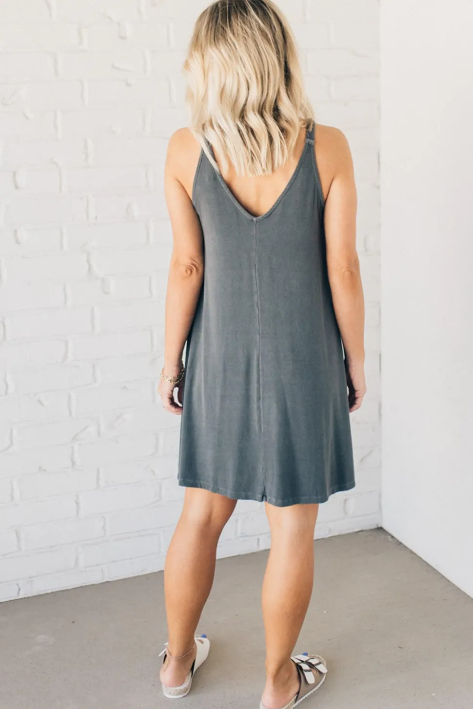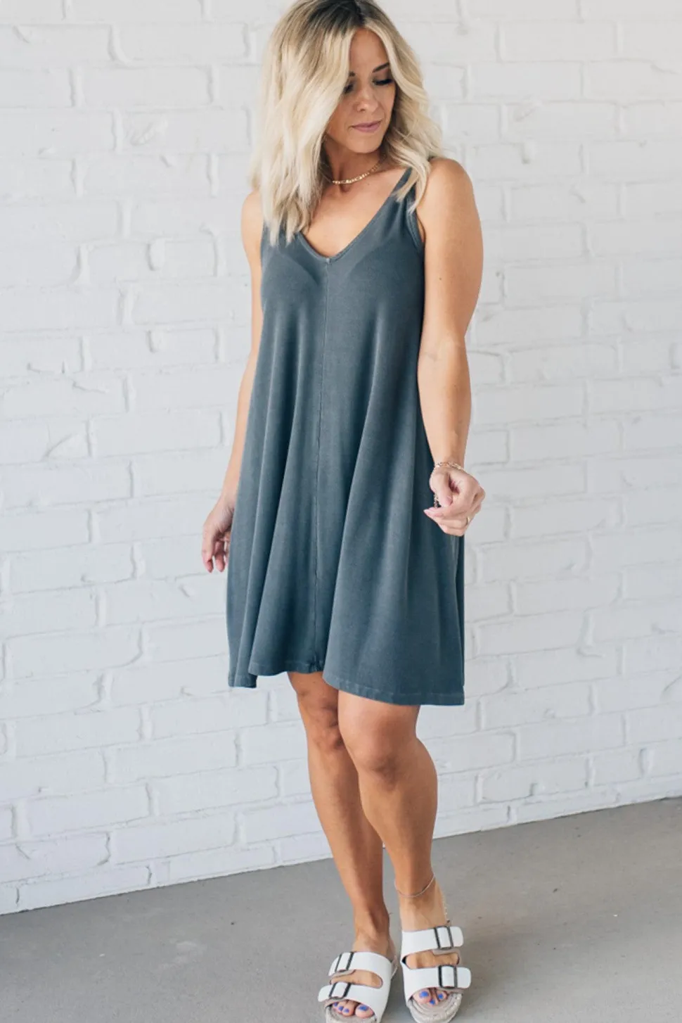 Look fantastic in this super soft Ribbed Shift Dress! Its mineral wash and slim ribbed texture caress your curves, while the flattering deep V-neck and knee-length skirt will make those legs look legendary! Comfort never looked so good!