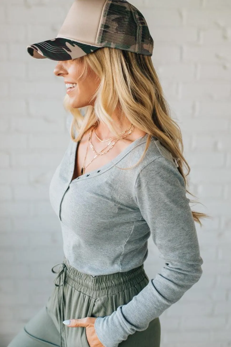 Quiet mornings. Cool afternoons. Long walks, coffee stops, and everything in between. The Ribbed Snap Henley is the kind of piece you forget how often you reach for—until laundry day. Designed with a soft ribbed knit and just the right amount of stretch, this top hugs gently without clinging. The snap-button neckline gives you styling options (leave a few undone for that effortless touch), while the worn-in feel makes it feel like it’s been in your closet forever.