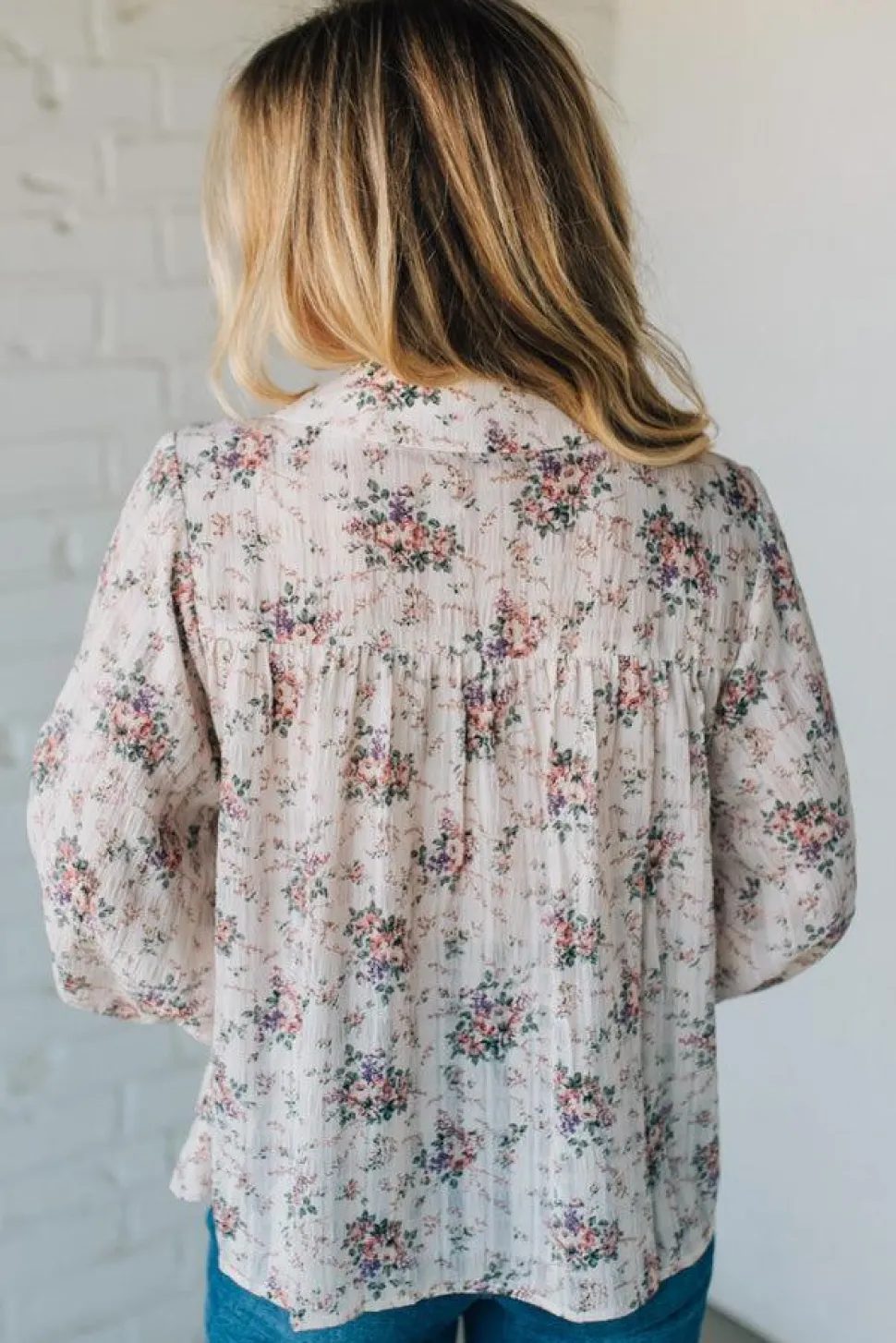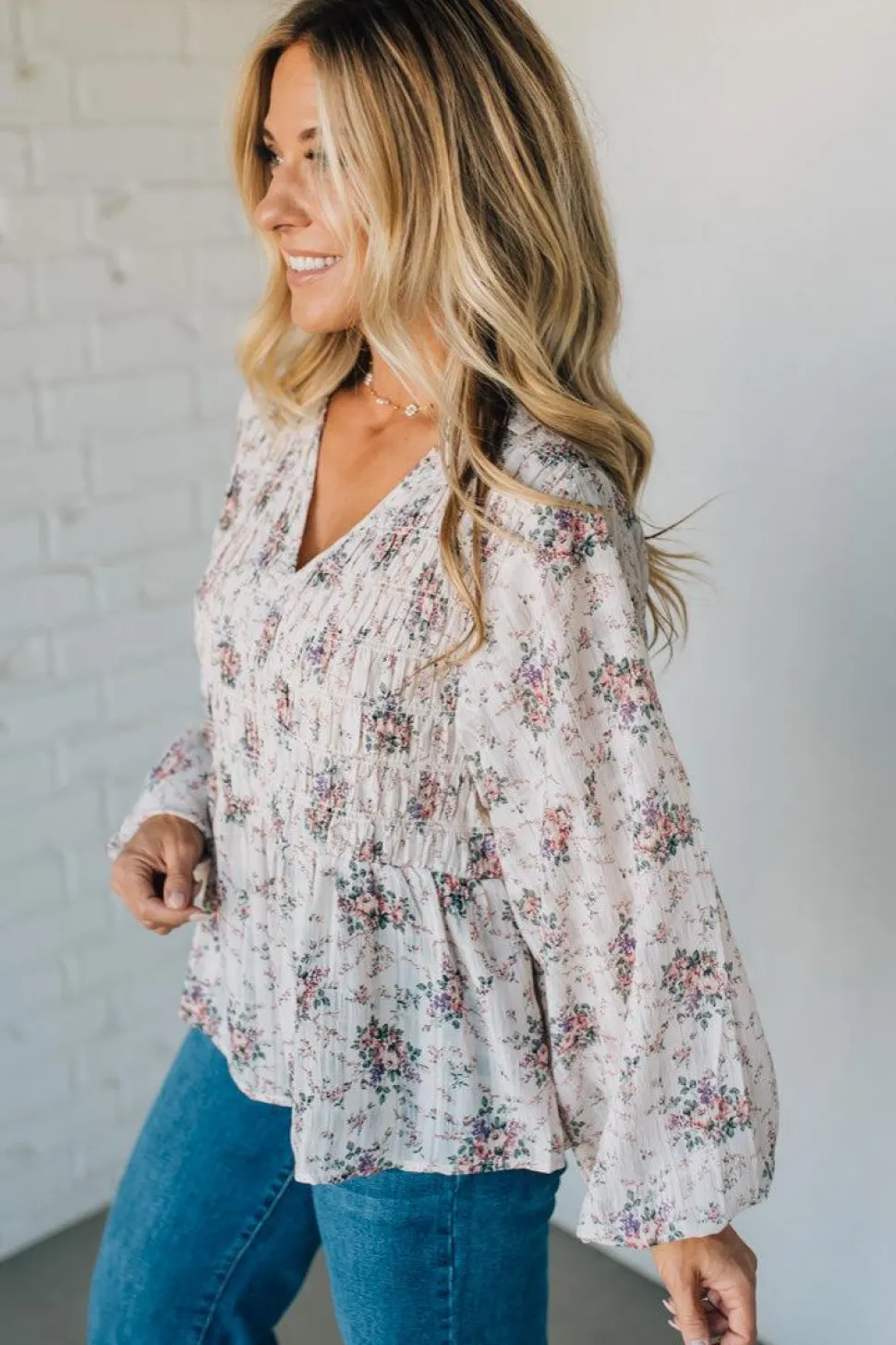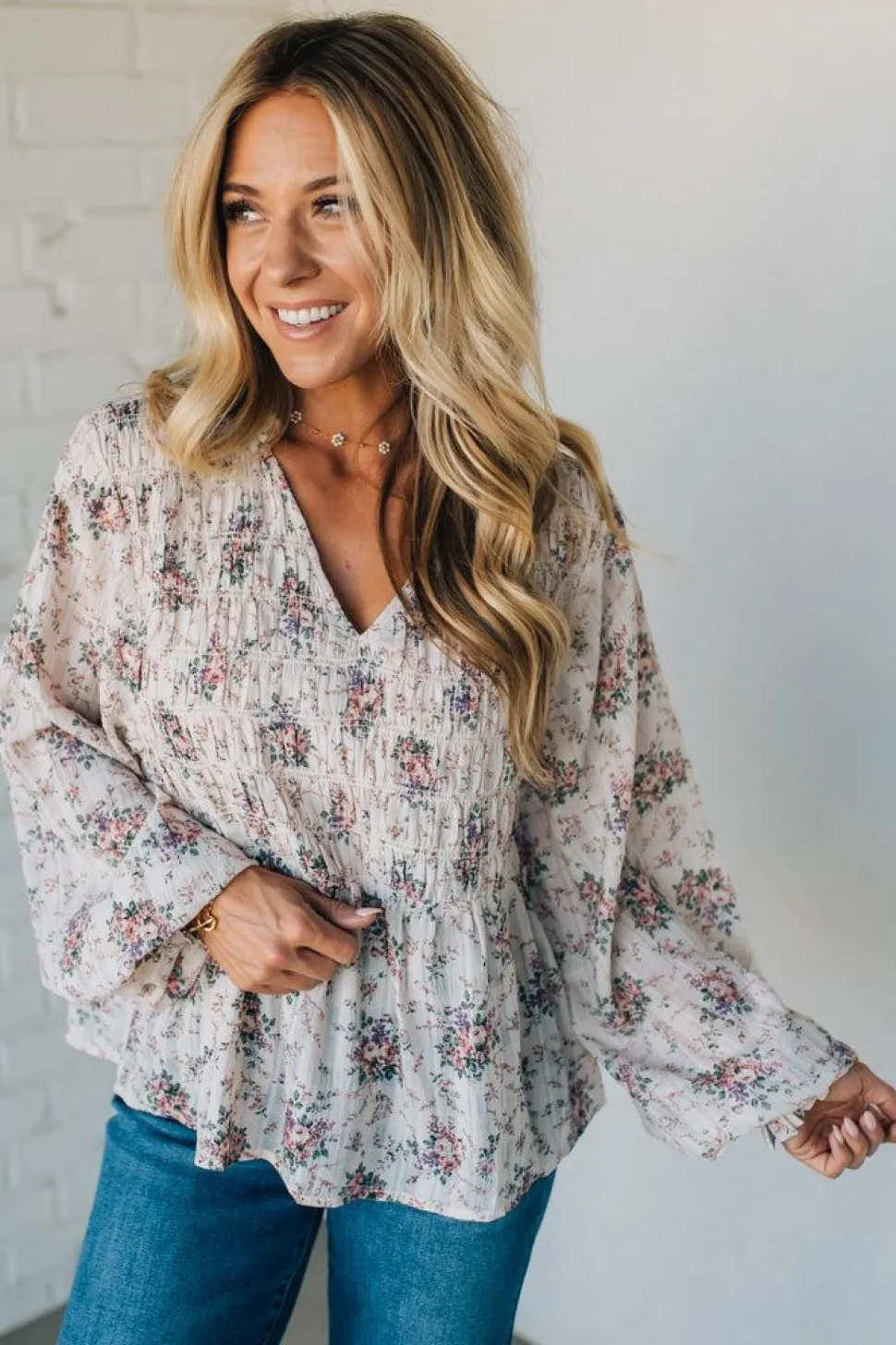 Buying for yourself or gifting someone who loves easy, polished style – this cream with pink floral printed woven V-neck top with smocked detail and balloon sleeves is perfect for spring brunches, workdays, and relaxed weekend moments.