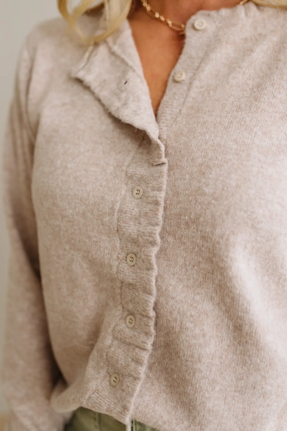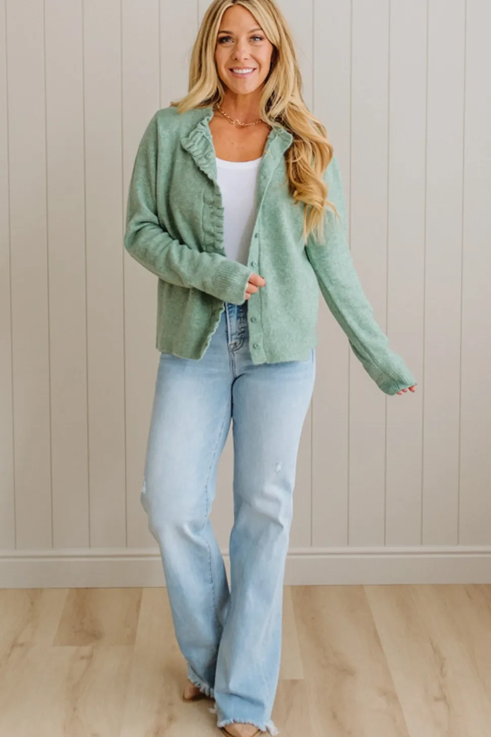 Like a warm hug with a feminine twist—this is the cardigan you’ll reach for on crisp mornings, coffee catchups, and cozy nights in. The Ruffle Trim Cardigan brings softness and charm with every detail, from the delicate frill along the neckline to the luxe knit blend that feels like a cloud against your skin.