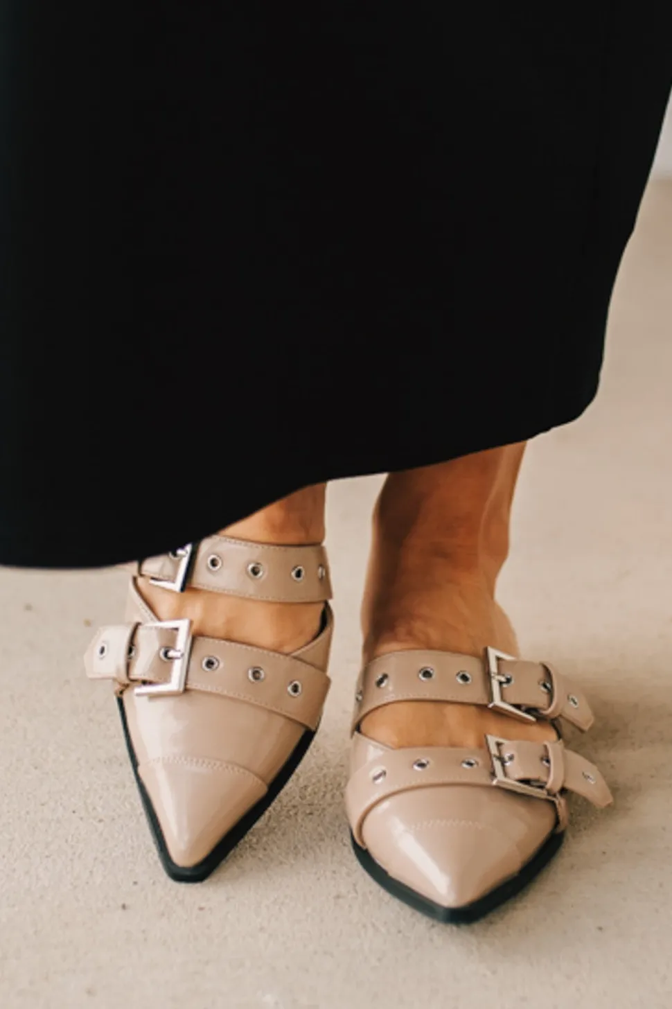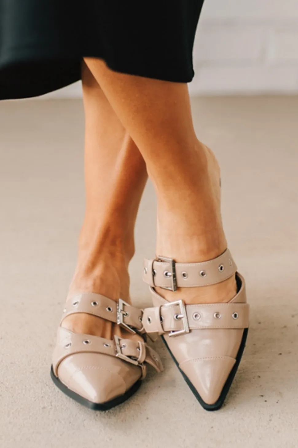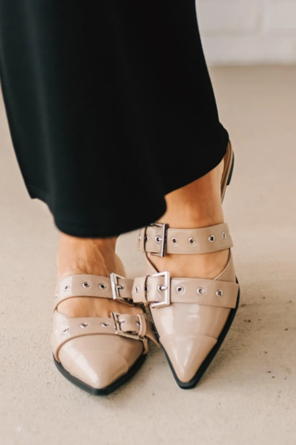 Unleash your inner sass with the Sawyer Studded Pointed Toe Flats. These sleek flats combine edgy detailing with a convenient slip-on style. Buckle up with dual straps and silver-tone hardware for a statement look. Perfect for everyday wear.