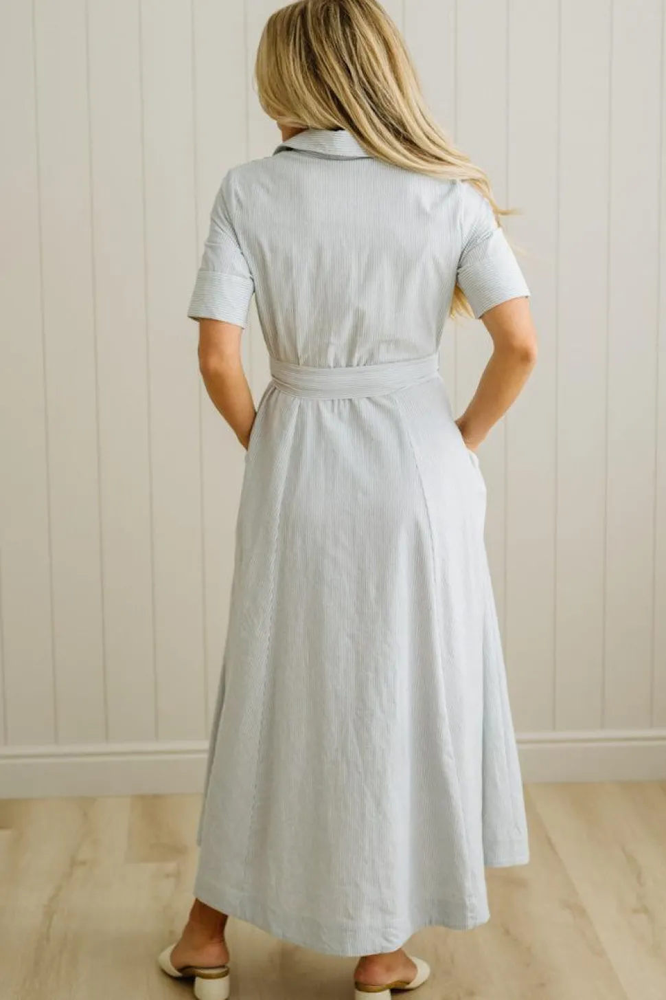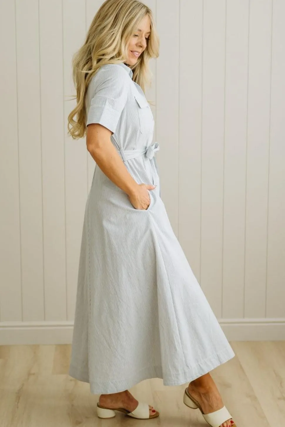 Crafted from a breathable cotton blend with subtle stripes, this tailored maxi features a classic shirt collar, double chest pockets, and a full button-down front. A belted sash cinches the waist just right, while an elastic back keeps it comfy. Add in the side pockets and you’re out the door.