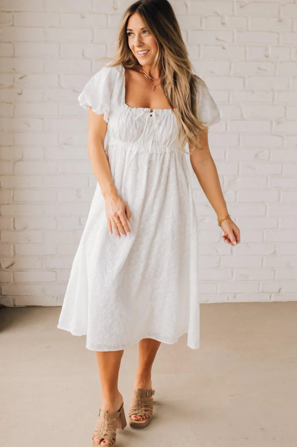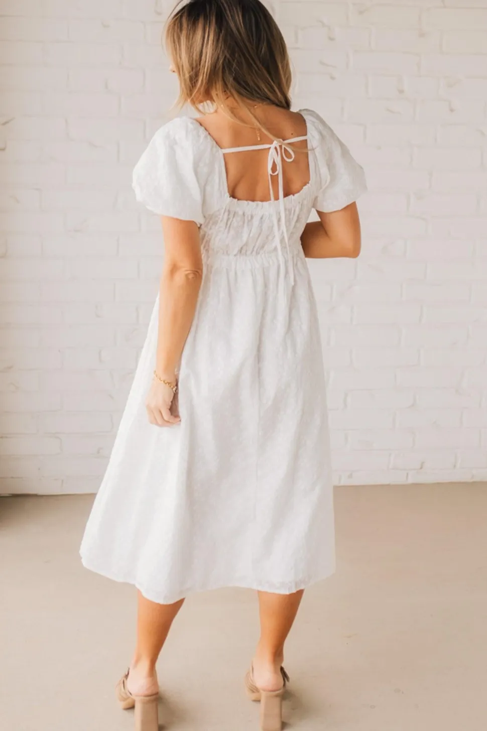 Fall in love with our Sweetheart Peasant Dress. Made with a square neckline and puff half sleeves, this white eyelet midi dress exudes both elegance and playfulness. Plus, the tie strap back adds a sweet touch to the overall look. Perfect for day or night, this dress will surely become a staple in your wardrobe.