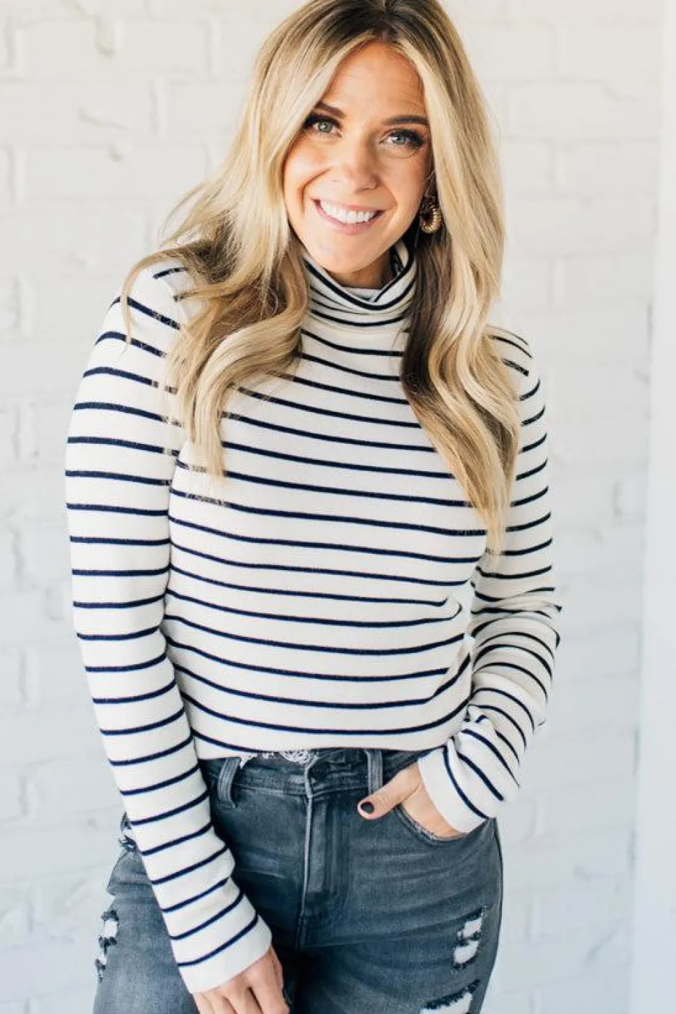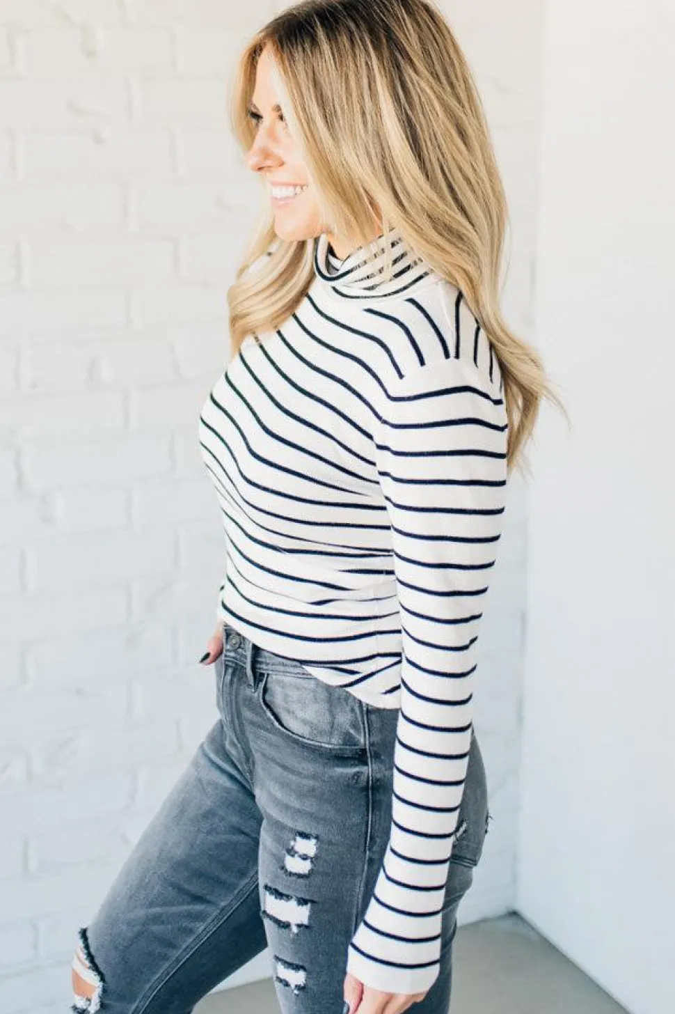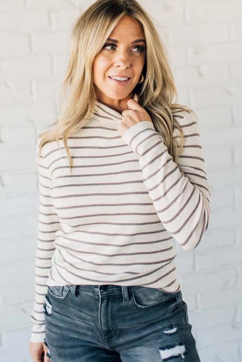 Stay cozy and stylish with our Tate Striped Turtleneck Top. This classic cut sweater features long sleeves and a fitted silhouette, with an on-trend turtle neck and thin striped pattern. Perfect for layering, this top is a must-have for your fall and winter wardrobe. (Sweater weather, here we come!)