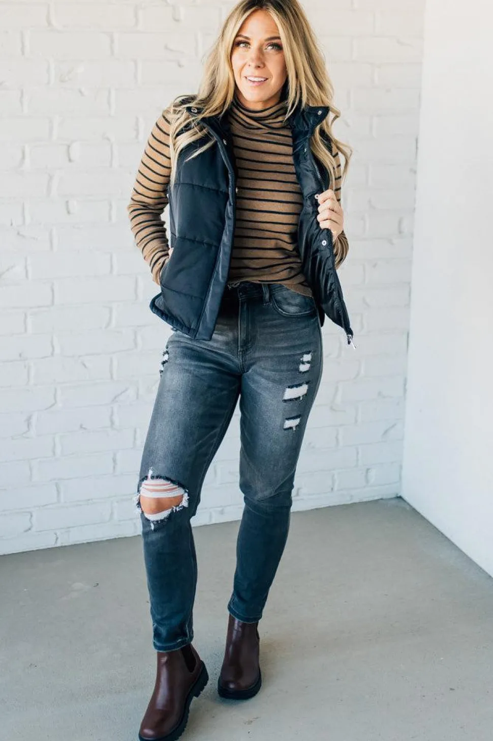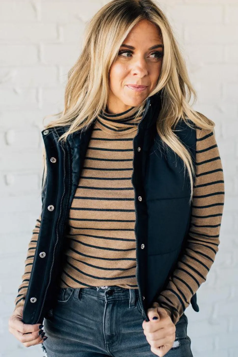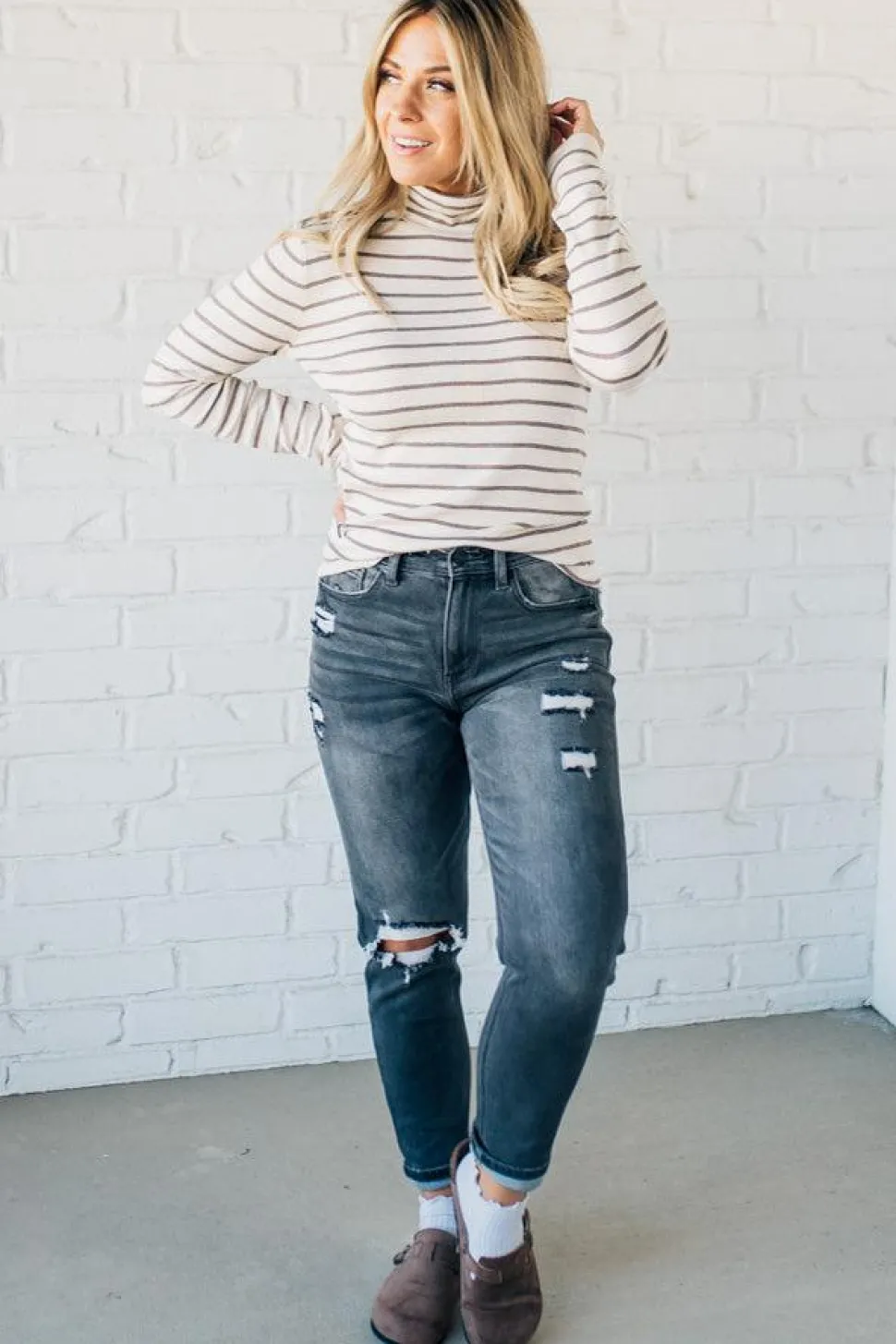 Stay cozy and stylish with our Tate Striped Turtleneck Top. This classic cut sweater features long sleeves and a fitted silhouette, with an on-trend turtle neck and thin striped pattern. Perfect for layering, this top is a must-have for your fall and winter wardrobe. (Sweater weather, here we come!)