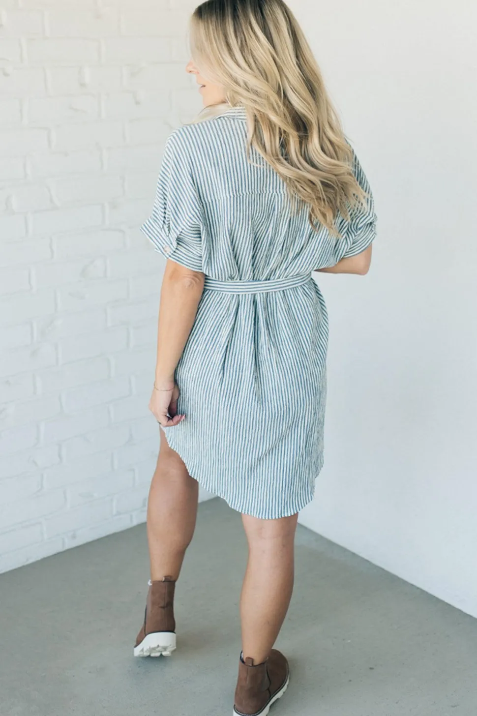 Introducing the Theo Striped Shirt Dress – a playful mix of menswear and feminine charm. Featuring taupe and ivory stripes with a button back half sleeve and removable waist sash for versatile styling. The high low hemline adds a unique touch to this classic shirt dress.