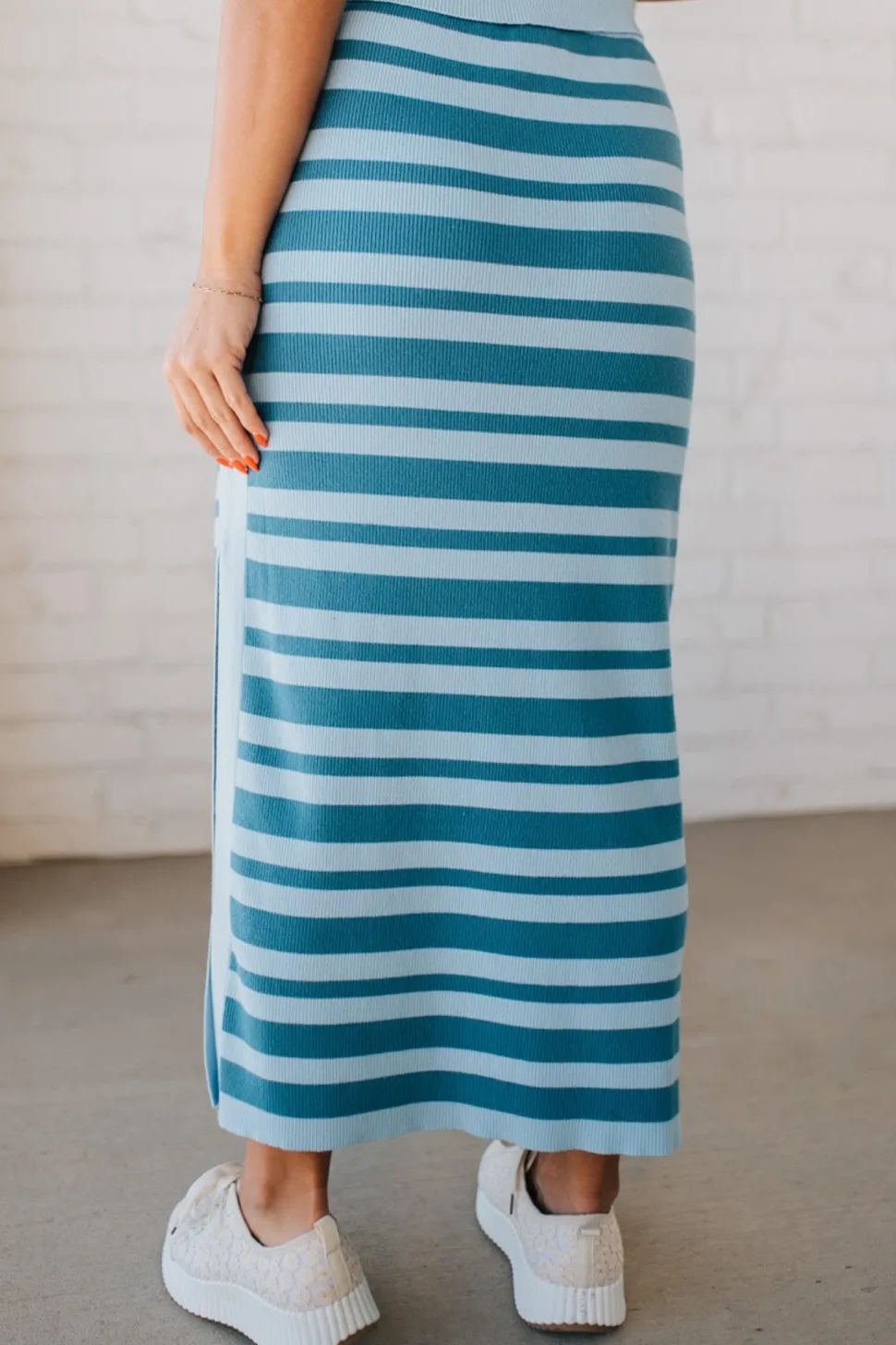 Take your style to the next level with our Top Tier Striped + Ribbed Skirt! Crafted in light blue and medium blue stripes, this maxi skirt features a ribbed stretch waistband and a high side slit for added comfort and flexibility. Perfect for any occasion, this skirt will have you looking effortlessly chic and stylish. Get ready to turn heads and make a statement!