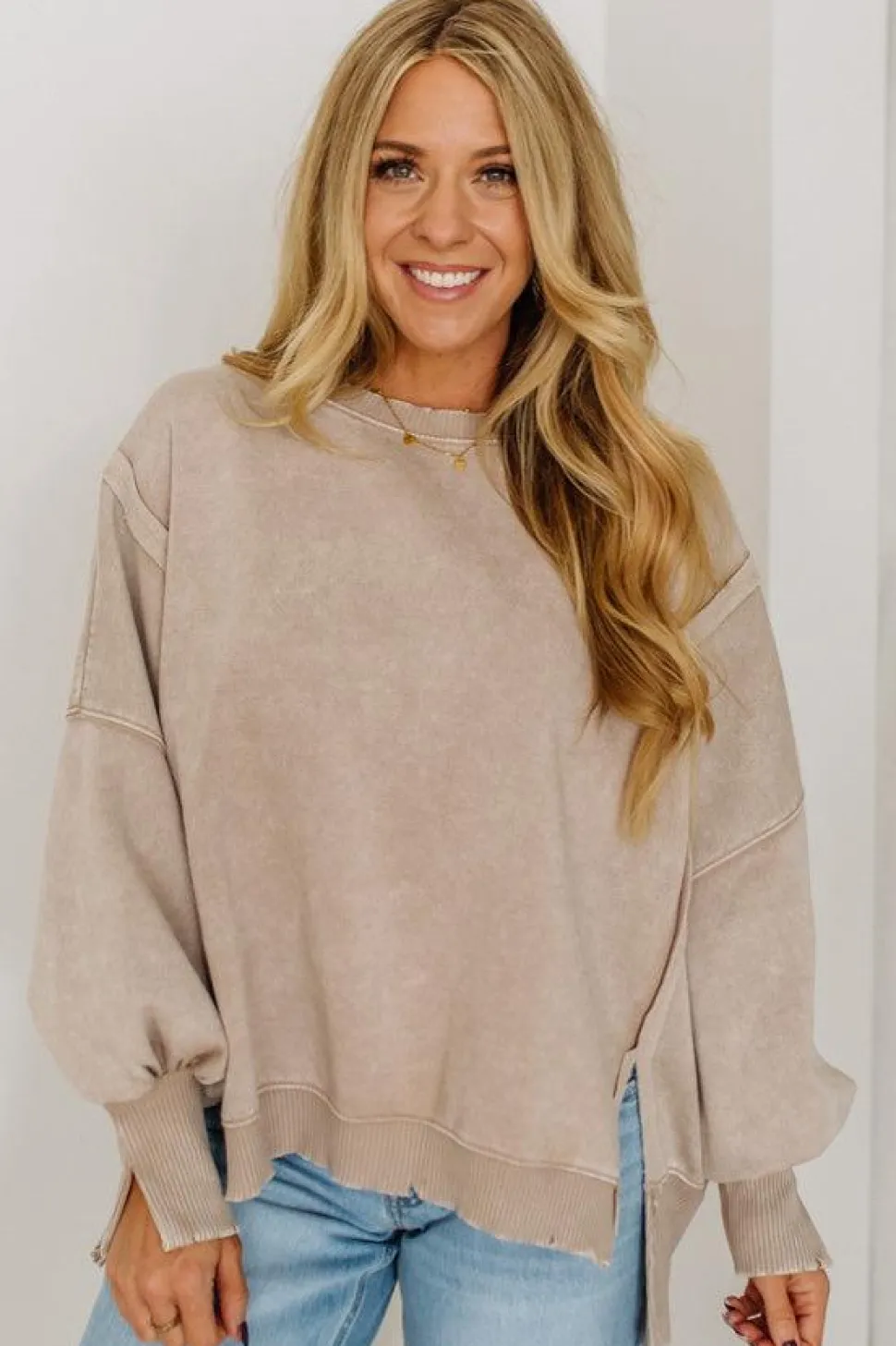- Self: Acid Wash Batwing High-Low Split Seam Fleece Pullover | 60% Cotton, 40% Polyester