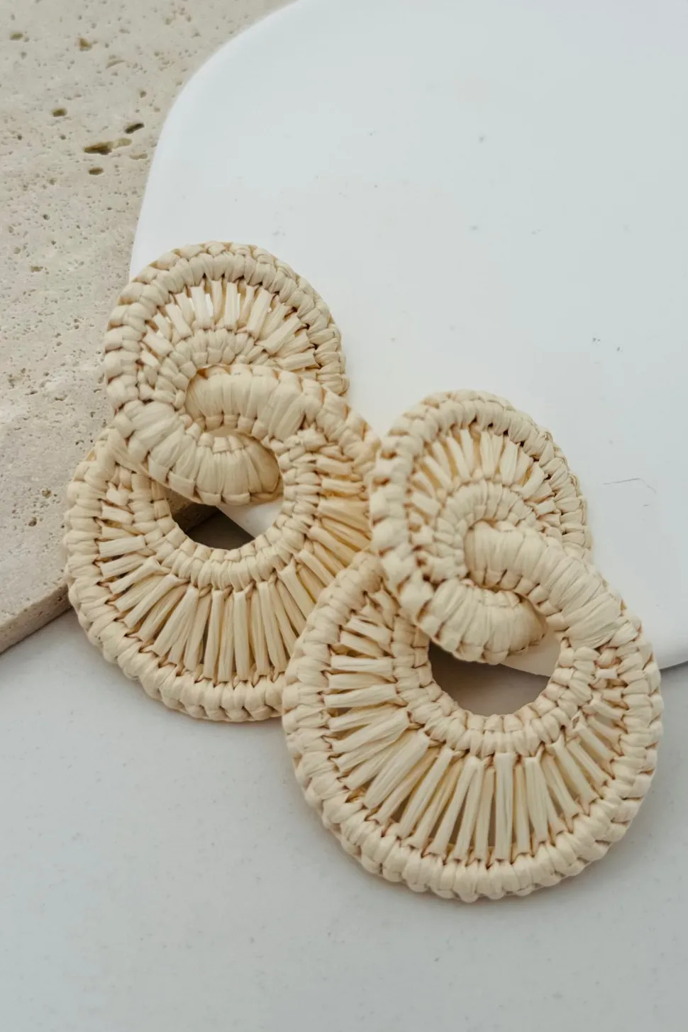 These unique earrings feature double hoops made from woven raffia straw, creating a playful and statement-making look. Perfect for adding a touch of quirkiness to any outfit, these earrings are sure to turn heads and showcase your personality!